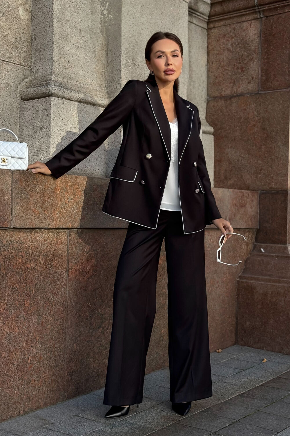 Женский брючный костюм URS — воплощение современного стиля, элегантности и уверенности. Этот черный костюм женский брючный создан для женщин, которые ценят безупречный внешний вид и классику в лучших традициях деловой моды. Элегантный жакет с серебристым кантом и аккуратными декоративными пуговицами придает образу изысканность и подчеркивает статус. Прямые брюки визуально вытягивают силуэт, создавая стройную и женственную линию. Костюм женский 2-х предметный, состоит из жакета и брюк, выполненных из костюмно-плательной ткани, для повседневной носки.