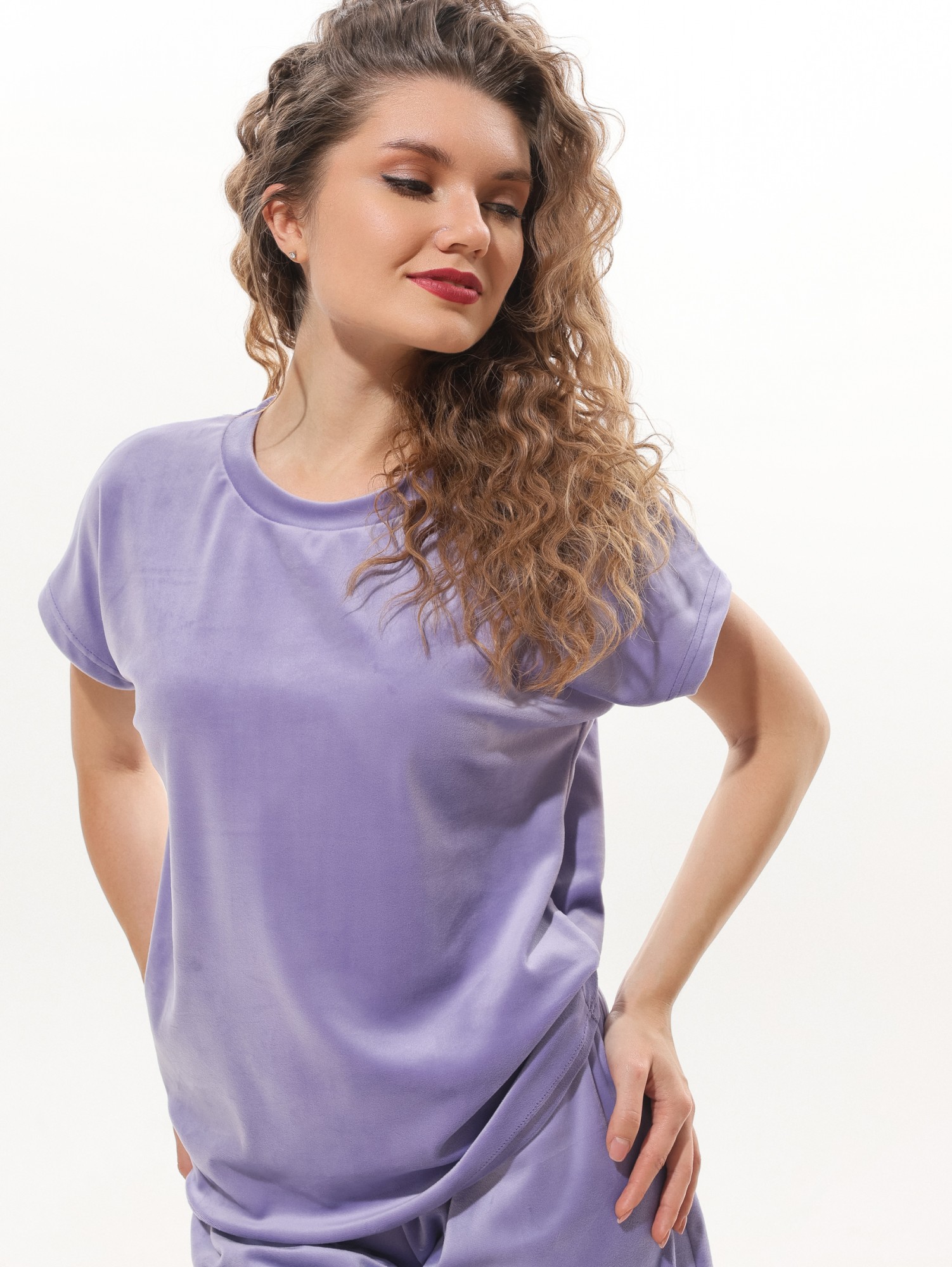 Костюм молодежный из трикотажного полотна «велюр-стрейч», состоящий из футболки и шорт.