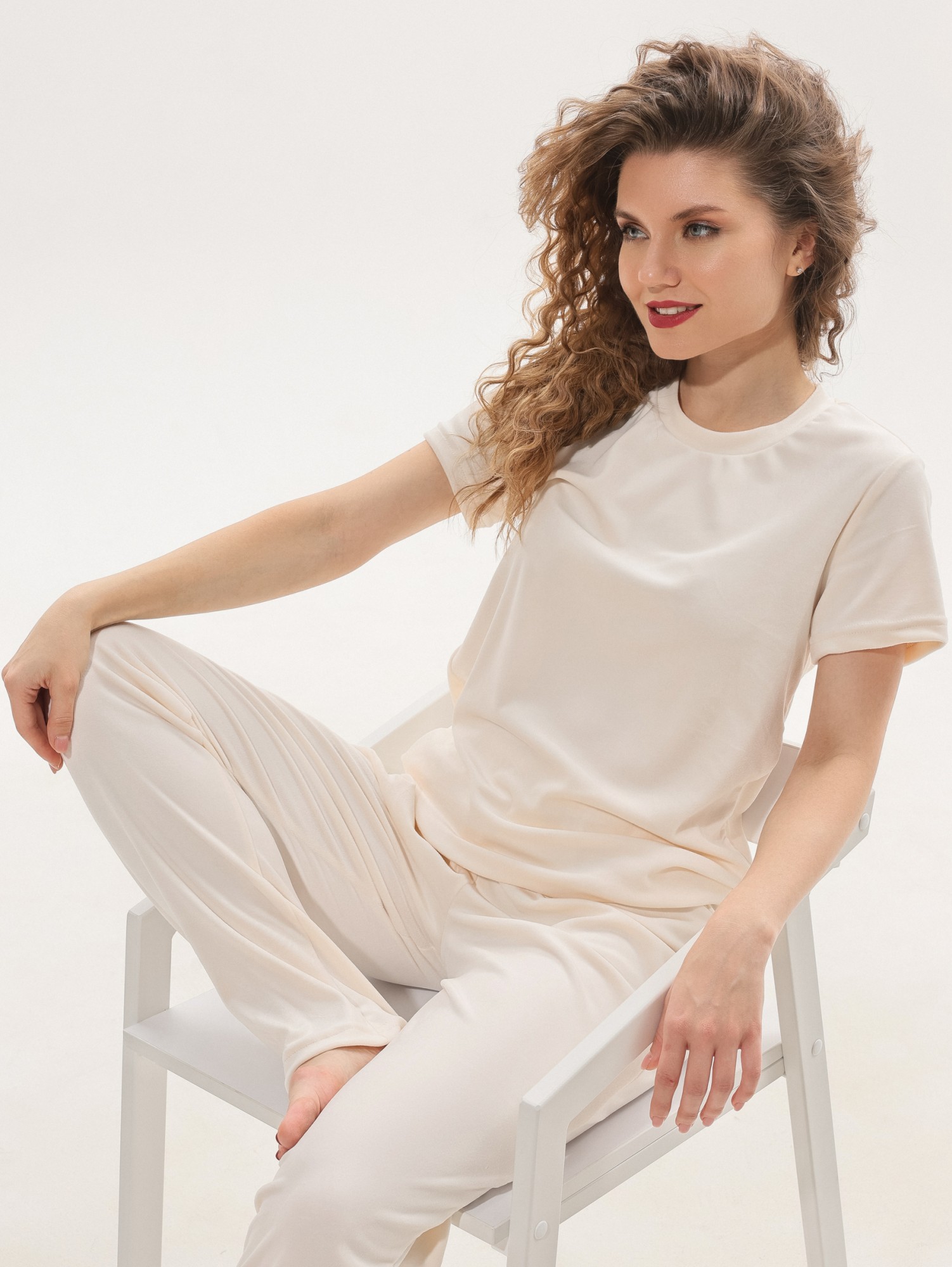Костюм молодежный из трикотажного полотна «велюр-стрейч», состоящий из футболки и брюк.