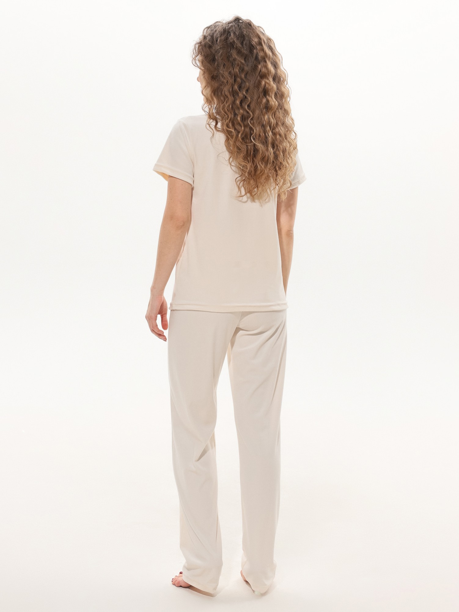 Брюки – длинные, свободного покроя, с эластичной тесьмой по талии.