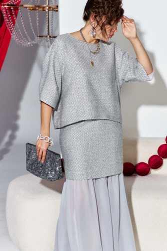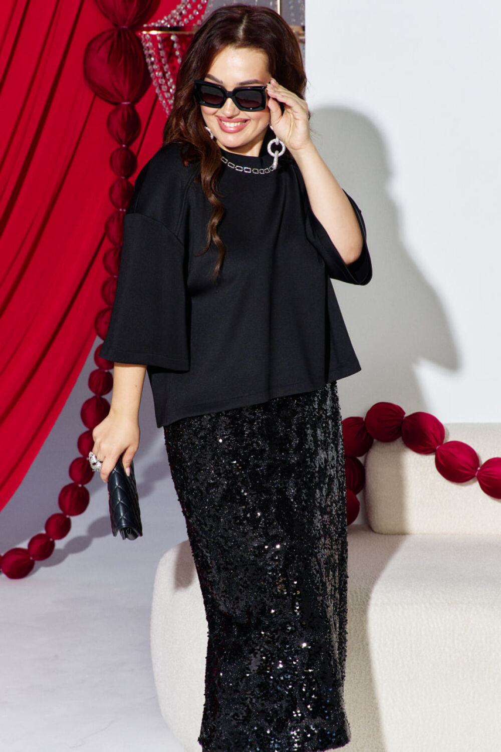 Черный женский комплект состоит из однотонной блузы и юбки миди, украшенной фактурной черной пайеткой. Общий контур ансамбля сдержан и элегантен: чистый черный цвет без лишних акцентов, но с выразительным игровым эффектом за счет текстур и бликов пайетки. Материалы гармонируют между собой — мягкость однотонной блузки контрастирует с фактурной, зеркальной поверхностью юбки, создавая ощущение глубины и лаконичной роскоши. Этот комплект подходит для вечерних мероприятий, деловых встреч и торжественных приемов, где ценят стиль, сдержанность и уверенность без лишних деталей.Блуза обнимает фигуру ровным, спокойным материалом, уютно садится по линии плеч и груди, создавая ощущение мягкости и уверенности. По текстуре она гладкая на ощупь, с легким теплом и бархатистым блеском, который подчеркивает тонкую фактуру материала. Блуза» оверсайз силуэта, с округлой формой горловины, декоративными кокетками по переду. Линия плеча в блузе спущенная, рукав втачной, широкий, длиной ¾. Спинка в блузе со средним швом, вырезом капелькой с застёжкой на петлю-пуговицу, декоративными кокетками. Низ в блузе ассиметричный. В качестве дополнительного декоративного элемента в блузе по горловине отделка в виде декоративной тесьмы. Юбка длиной миди держит внимание за счет ткани, украшеной в густую, слегка крупную фактурную пайетку. Юбка прямого силуэта с притачным поясом со вставкой эластичной тесьмы-резинки в бочках. В среднем шве заднего полотнища юбки застёжка на молнию и пуговицу в поясе. Длина джемпера по спинке 60 см (р 52-56), 61 см (р 58-62). Длина рукава 29 см. Длина юбки 79,5 см.