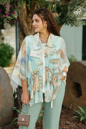 Комплект женский, двух предметный, состоящий из блузки и блузы. Этот комплект читает женственность спокойно — без пафоса. Он рассказывает о комфорте, о внимании к текстурам и о желании выглядеть легко, но продуманно. Вместе они создают образ, где современная минималистика встречается с женственной романтикой: практично, но вдохновляюще. Главный акцент комплекта – это невесомая шифоновая блузка с абстрактным цветочным принтом в пастельных тонах, создающая ощущение воздушности и легкости. Ее свободный крой и завязки на талии позволяют регулировать силуэт, добавляя динамичности. Его дополняет базовая белая блуза, которая служит чистым холстом для более яркого элемента. Блузка свободного силуэта, с центральной застёжкой на тесьму молнию по переду; воротник в блузке отложной, ассиметричный. В качестве отделочного элемента по переду блузки - кулиса со шнуром из основной ткани. Рукав цельнокроеный, длиной 7/8, с притачной манжетой. По спинке отрезная кокетка. Низ в блузке ассиметричный. Блуза прямого силуэта с округлой формой горловины и нагрудными вытачками по полочке. Спинка без особенностей. Данный комплект имеет множество вариантов стилизации. Можно неебрежно заправить переднюю часть блузы в джинсы — блузка свободно расправится сверху. Застегнуть молнию наполовину, чтобы создать V-образный переход между шифоном и топом. Длина верхней блузы по центру спинки 75,5 см (р 52-56), 76 см (р 58-62). Длина рукава верхней блузы 56 см (р 52-56), 57 см (р 58-62).