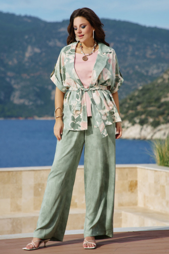 Просто роскошный комплект, который обязан быть в гардеробе у каждой модницы! Подойдет для офиса, прогулок и встреч. Невероятный принт, текстура ткани и крой создадут образ, в котором вы будете блистать. Он так же идеален для повседневных образов, путешествий, а приятная к телу ткань создаст комфорт при носке. Комплект женский, трехпредметный состоящий из жакета, блузы и брюк. Жакет прямого силуэта без застёжки с воротником пиджачного типа. По спинке жакета отрезная кокетка. Рукав в жакете цельнокроеный с отложной манжетой по низу и декоративной патой фиксирующейся пуговицей. В боковых швах от низа разрезы, в комплекте пояс из основной ткани с декоративной пряжкой- полукольцами. Брюки прямого силуэта, длинные. Пояс в брюках притачной с эластичной тесьмой-резинкой, которая обеспечивает максимально комфортную посадку на любой тип фигуры. В боковых швах прорезные карманы. Жакет с цветочным принтом и прямые брюки пастельного оттенка в тон, месте они создают гармонию, где каждая деталь дополняет другую, а не перетягивает внимание. Блуза прямого силуэта является акцентным пятном в данном комплекте. Горловина округлой формы, по переду нагрудные вытачки. Спинка без особенностей. В боковых швах от низа блузы разрезы. Это образ для женщины, которая ценит и смелость, и элегантность, которая не боится выделяться, но делает это со вкусом. Она понимает, что настоящая стильность — не в количестве деталей, а в их идеальном сочетании. Комплект становится метафорой самой женщины: с одной стороны — творческая, яркая, выразительная, с другой — собранная, целеустремленная, основательная. И в этом противоречии рождается совершенство. Длина жакета 73,5 см (р 52-56), 74 см (р 58-62), длина рукава 35 см (р 52-56), 38 см (р 58-62). Длина блузы 65,5 (р 52-56), 66 см (р 58-62), длина рукава 8 см (р 52-56), 8,5 см (р 58-62). Длина брюк 108 см (р 52-56), 108,5 см (р 58-62).