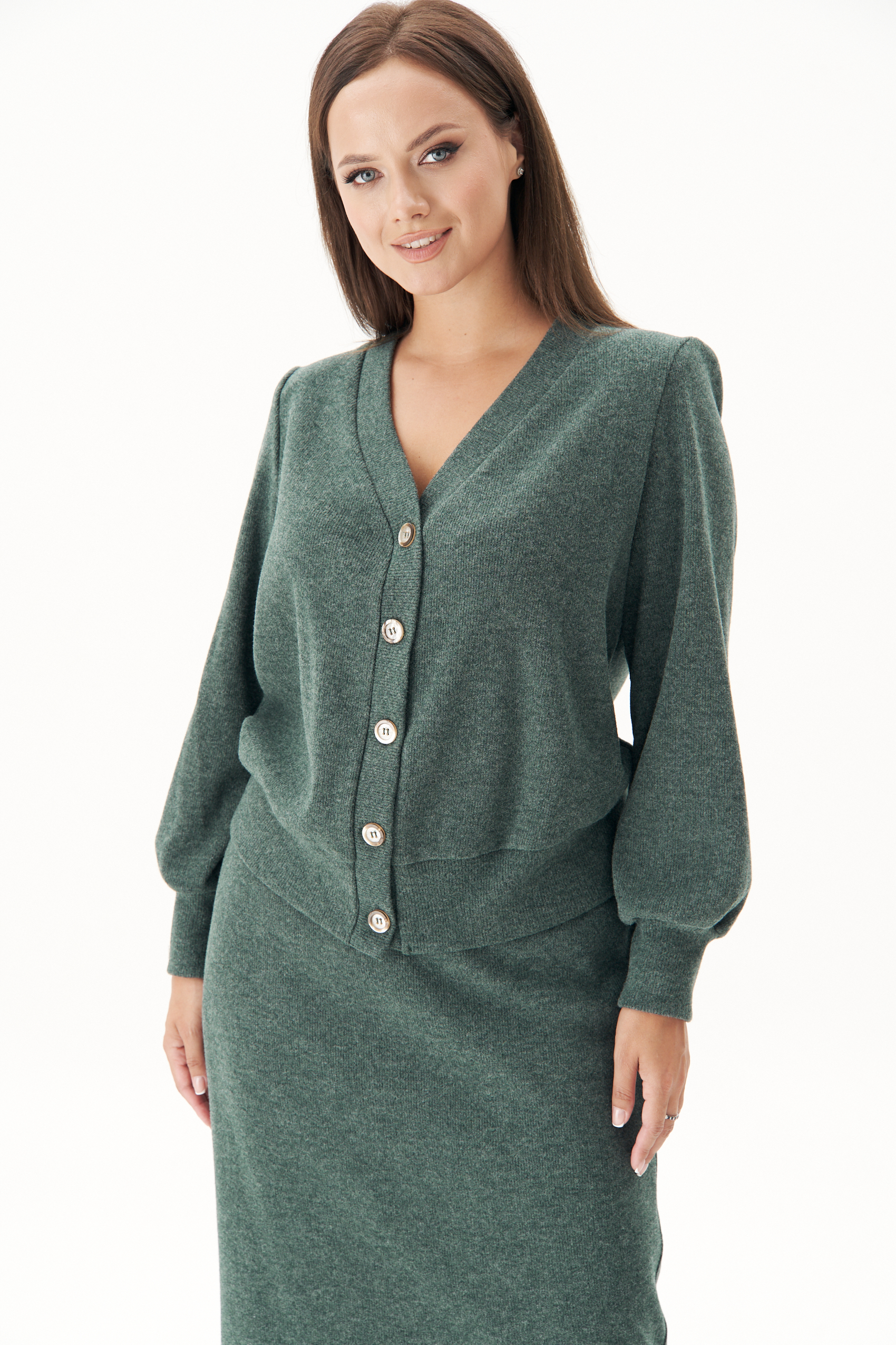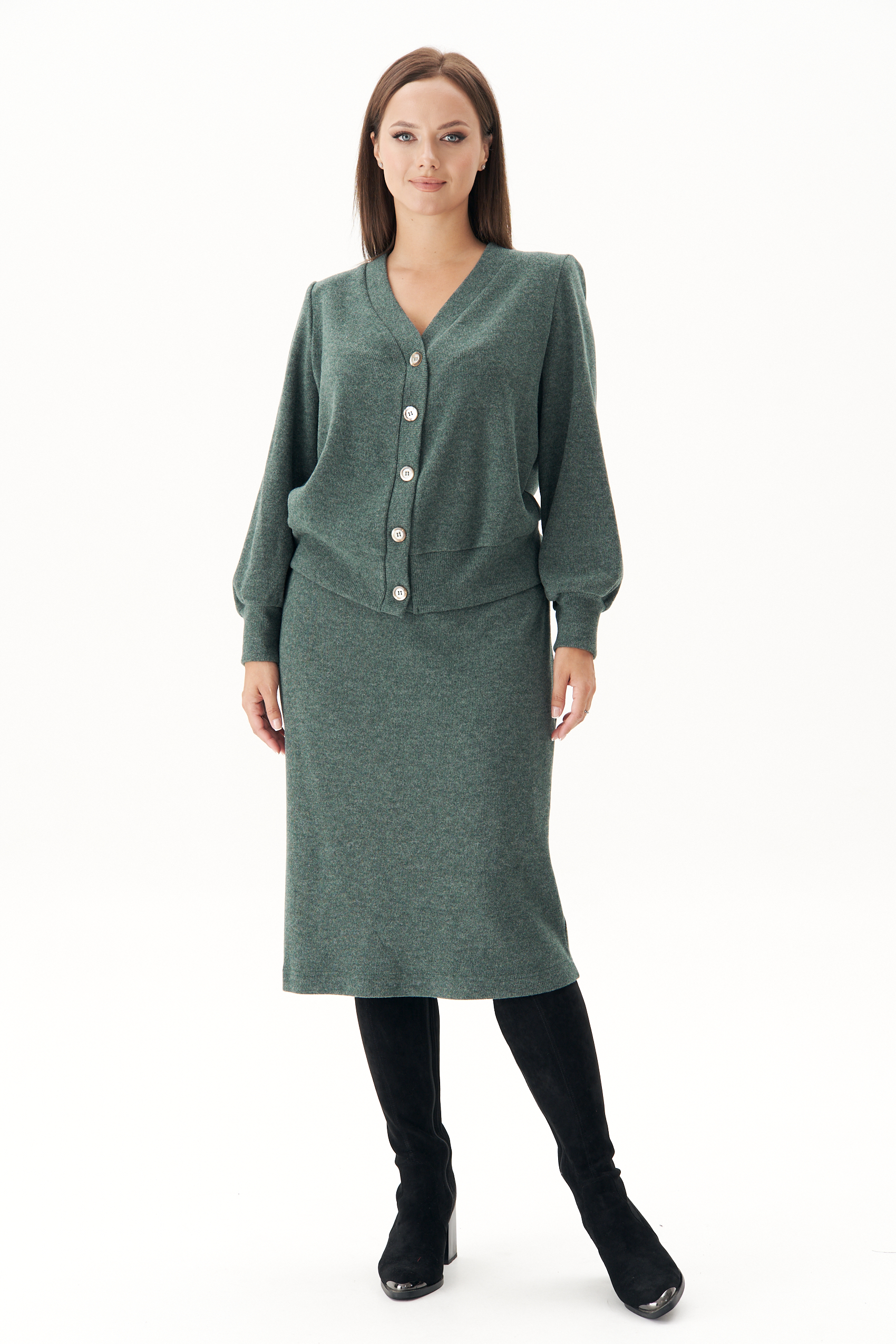 Модный гардероб современной женщины очень разнообразен, но есть ещё много крутых идей, как составить оригинальный уникальный образ. Среди таковых - трикотаж, ведь его легко трансформировать в разнообразные нескучные аутфиты. В качестве базы солирует модный трикотажный комплект с юбкой. Классическая юбка длины миди с молнией в боковом шве и эластичным поясом. Джемпер свободного силуэта, втачного покроя, с центральной застёжкой на притачной планке на петли и пуговицы. По низу джемпера и рукавов - притачные манжеты. Чёткая линия плеча достигается использованием плечевых накладок. Длина юбки около 70 см. Длина джемпер около 54 см. Длина рукава около 60 см.