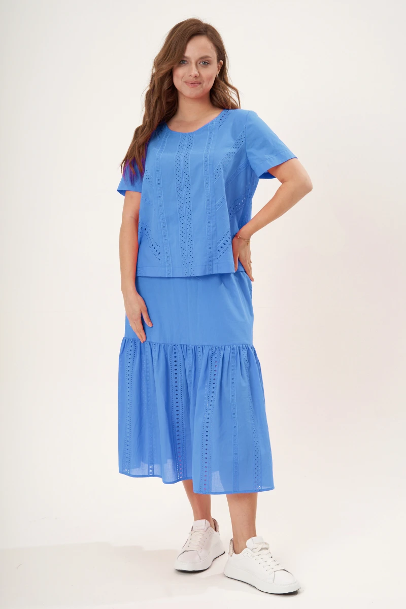 Самые популярные летние костюмы представлены в монохромном исполнении, где палитра и цветовое решение задаёт настроение и тон всему женскому образу. Не бойтесь выбирать сочные и такие необыкновенные оттенки, как фуксия, изумрудно-зелёный, насыщенный сине-голубой. Они сделают образ динамичным, экспрессивным и запоминающимся.Летний лёгкий костюм состоит из блузы и юбки, выполненный из хлопкового шитья в сочетании с однотонной тканью. Блуза упрямленного силуэта с круглым вырезом горловины и застёжкой на планке по центру спинки.Перед с вертикальными рельефами, что зрительно вытягивает фигуру. Боковые части переда и спинка с диагональным расположением рисунка в виде ажурных полос.Рукава втачные, короткие.Юбка длины миди на притачном поясе с эластичной лентой и застёжкой в боковом шве на потайную тесьму - молнию.Широкий волан юбки ажурный с лёгкой сборкой по линии притачивания.Верхняя часть юбки - из однотонной ткани, непрозрачная, на подкладке.Длина блузы по спинке около 55 см. Длина рукава около 21 см. Длина юбки около 84 см.