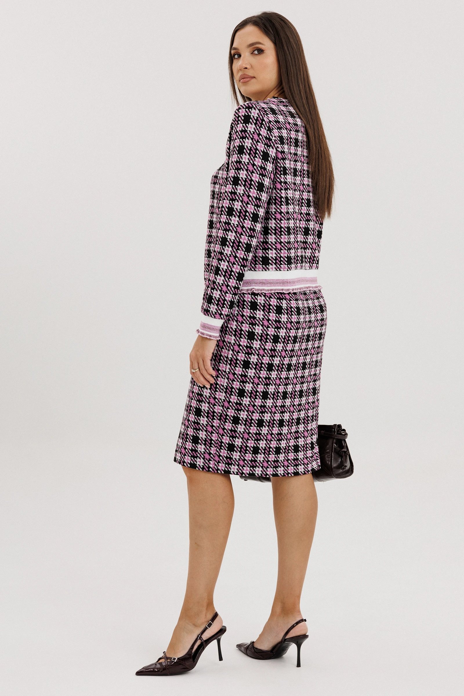Модный трикотаж стал бесспорным в этом осеннем сезоне. Носить любимые и практичные трикотажные вещи теперь можно смело, не беспокоясь о модных тенденциях, а только соответствуя им. Практичность такого гардероба сложно переоценить, вещи из одного лука можно смело сочетать с другими вещами и при этом выглядеть супер современно. Комплект состоит из джемпера и юбки. Джемпер свободного силуэта с втачным рукавом. Застежка центральная на петли и пуговицы. По линии борта, низу изделия, рукавам и горловине - отделочная эластичная тесьма довяз с легким блеском. Юбка зауженная к низу, на притачном поясе с частично эластичными вставками в области боковых швов.