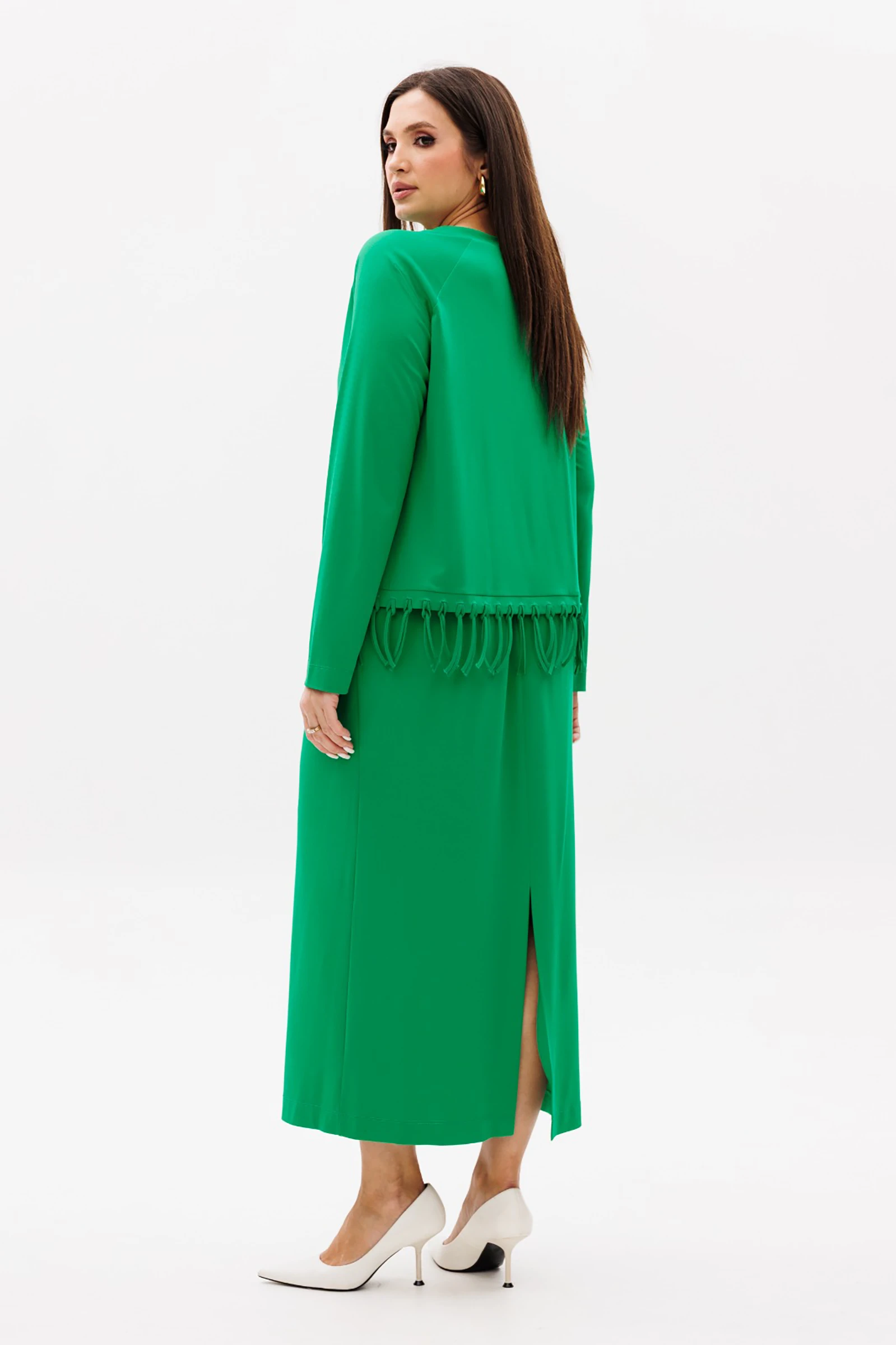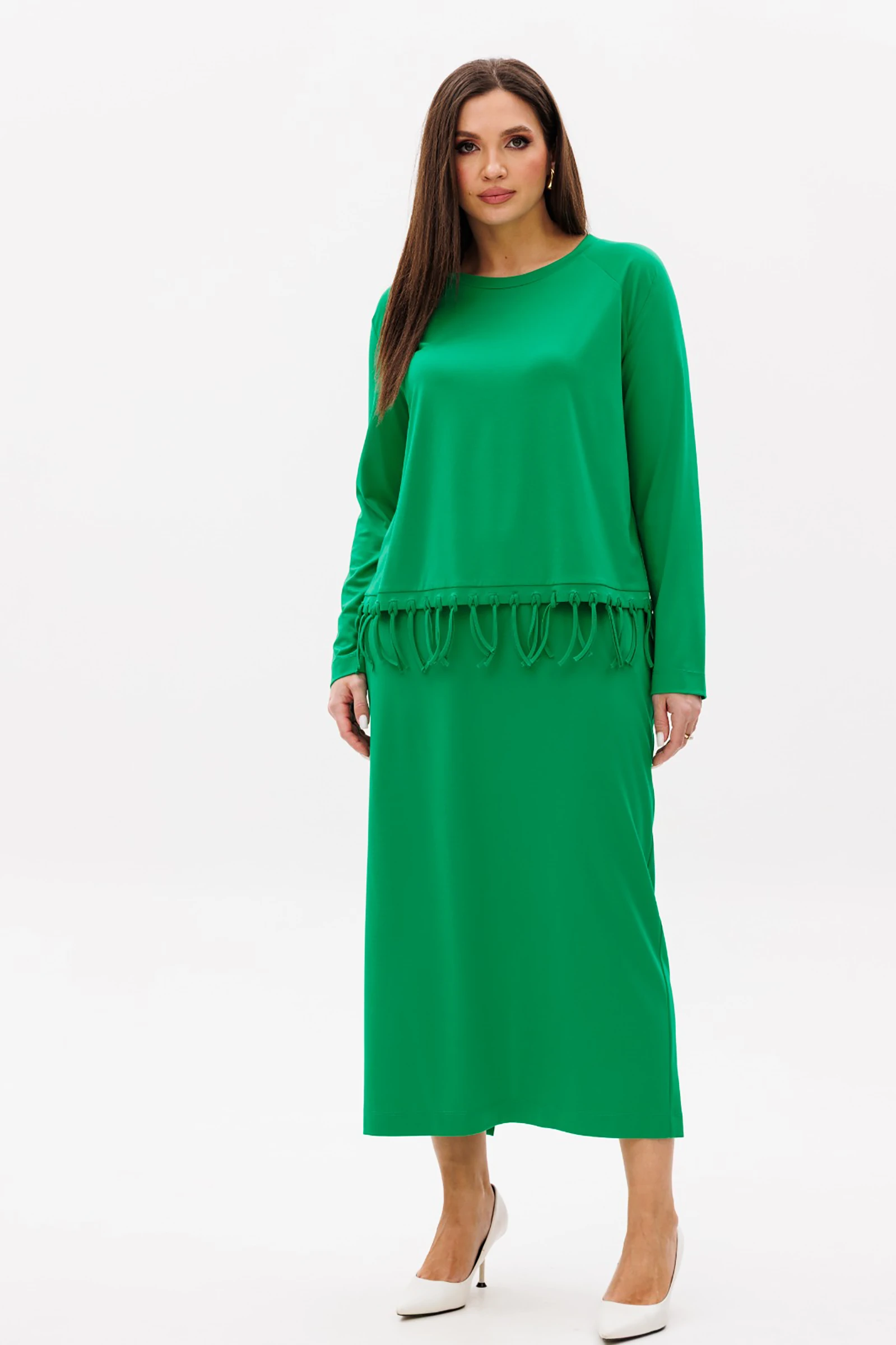 Если Вам нравится чувствовать себя свободно и непринуждённо, то трикотажный костюм с юбкой - Ваш идеальный выбор. Весна - время обновления, поэтому яркий цвет и игривая модель с бахромой на волне актуальности, она снижает градус обыденности и придаёт образу дух свободы.Свободная блуза А-силуэта, покроя реглан с круглым вырезом горловины. Низ изделия с отделочной полоской и бахромой.Юбка макси, на эластичном поясе, с наклонными боковыми карманами и шлицей по заднему полотнищу.Длина блузы около 52 см. Длина рукава с плечом около 74 см. Длина юбки около 80 см.