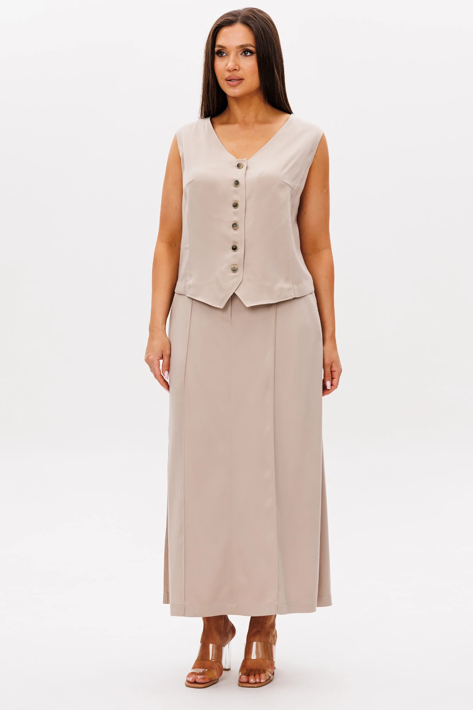 Костюм с жилетом - прекрасное решение для смелых экспериментов. Выполненный в нейтральной цветовой гамме, он позволяет дополнять себя различными аксессуарами и создавать каждый раз новые актуальные образы.Жилет полуприлегающего силуэта с центральной застёжкой и фигурным бортом. Полочка с боковым рельефом и нагрудной вытачкой. Спинка с центральным швом, боковым рельефом и талиевой вытачкой.Юбка А-образного силуэта с центральным швом с высоким разрезом по переднему полотнищу. Заднее полотнище с центральным швом, вытачками и застёжкой на тесьму-молнию. Пояс притачной с частично эластичными вставками. По боковым швам - наклонный карман.Длина юбки около 87 см, длина жилета около 52 см.