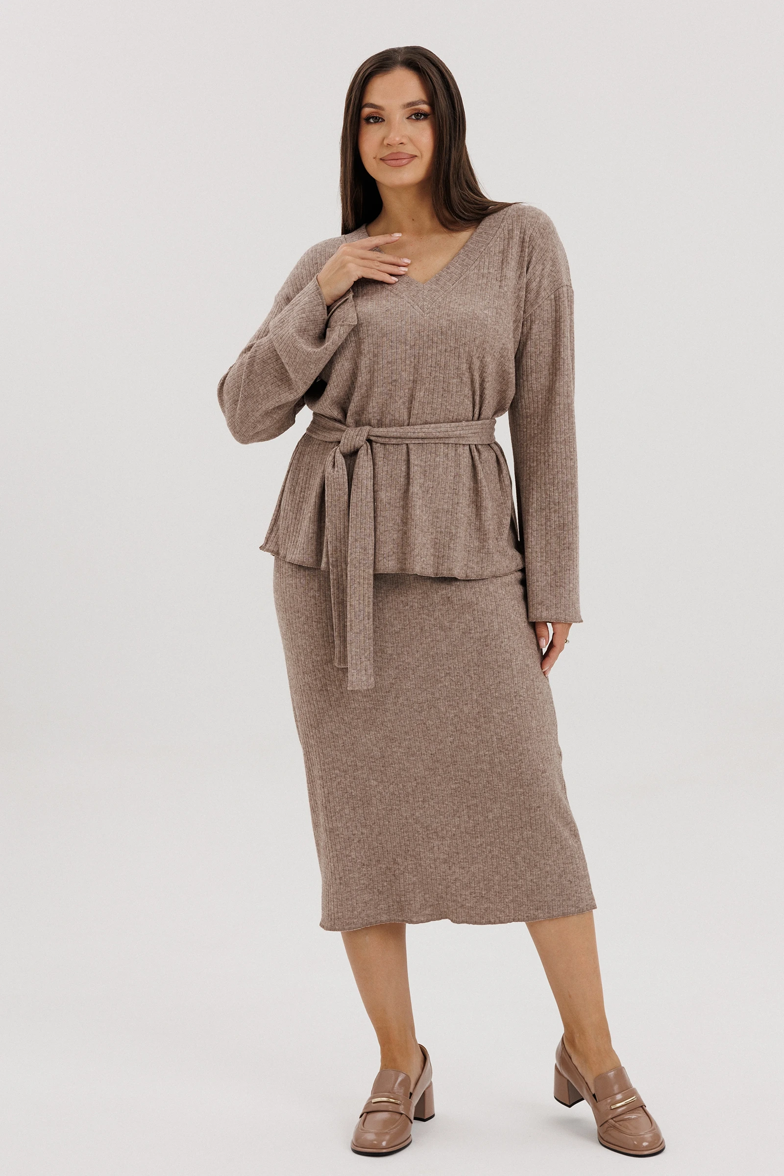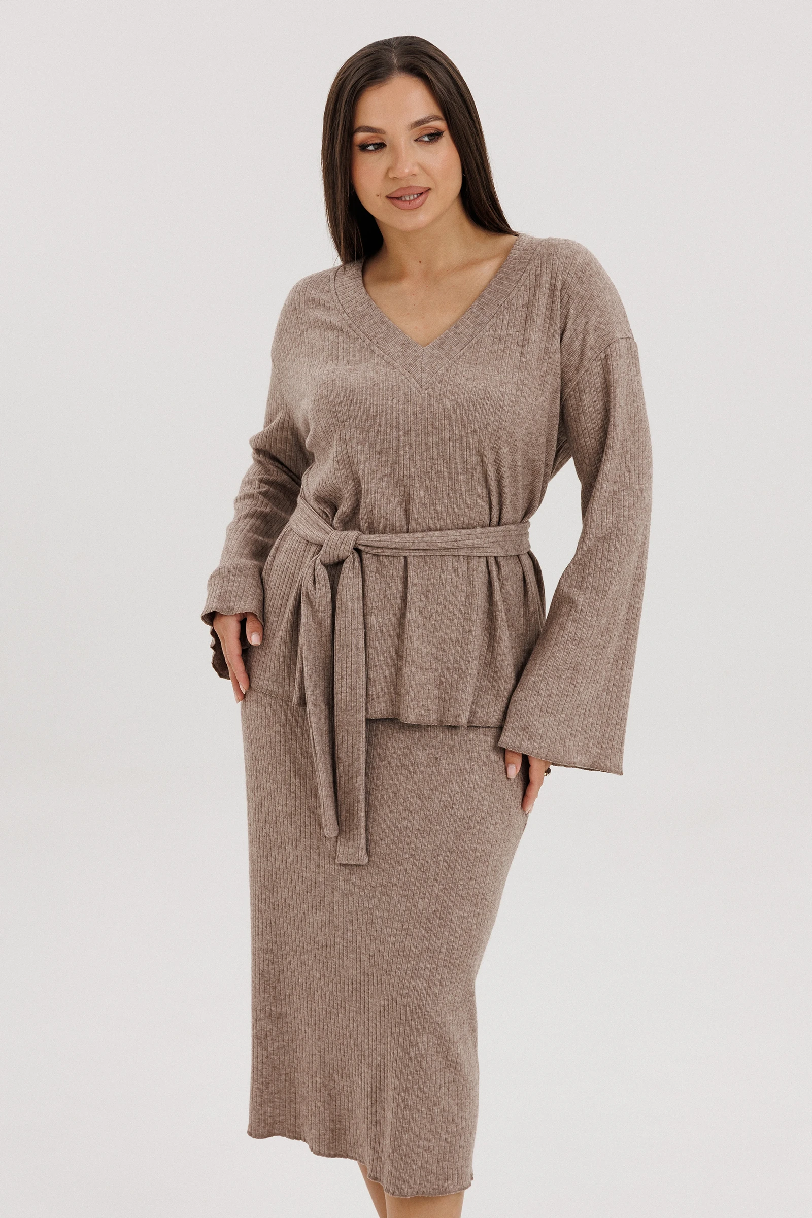 Трикотажный костюм, остаётся ли он модным, феминиста спорит до сих пор. С одной стороны, в соцсетях модных блогеров эти удобные комплекты буквально прописались, с другой, некоторые модели из трикотажа ой, как сложно назвать стильными - и где грань?Что отличает современный трикотажный костюм от его неактуальной версии? Первое - отсутствие лишних деталей, минимализм в этом вопросе - наше всё. Второе - у него есть воздух, т.е. некоторый объём, который даёт свободную посадку и делает модель аккуратной и дорогой.Свободный джемпер с заниженной линией плеча, рукавом, расширенным к низу, и -образным вырезом.Юбка прямая, длины миди, на эластичном поясе, с застёжкой в боковом шве на потайную молнию.Длина джемпера около 67 см. Длина рукава с плечом около 74 см. Длина юбки около 75 см.