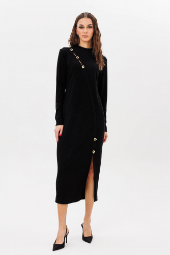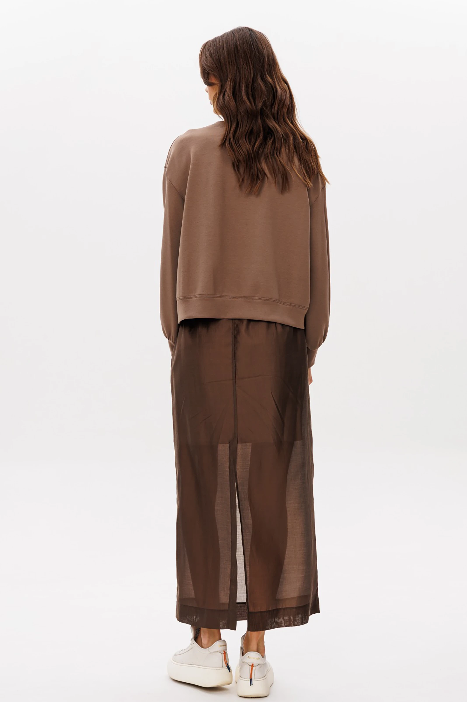 Прямая юбка длины макси на эластичном тонком поясе, с уютной трикотажной хлопковой подкладкой.  Заднее полотнище юбки с центральным швом, талиевой вытачкой и высокой шлицей. Застёжка на потайную тесьму-молнию.
