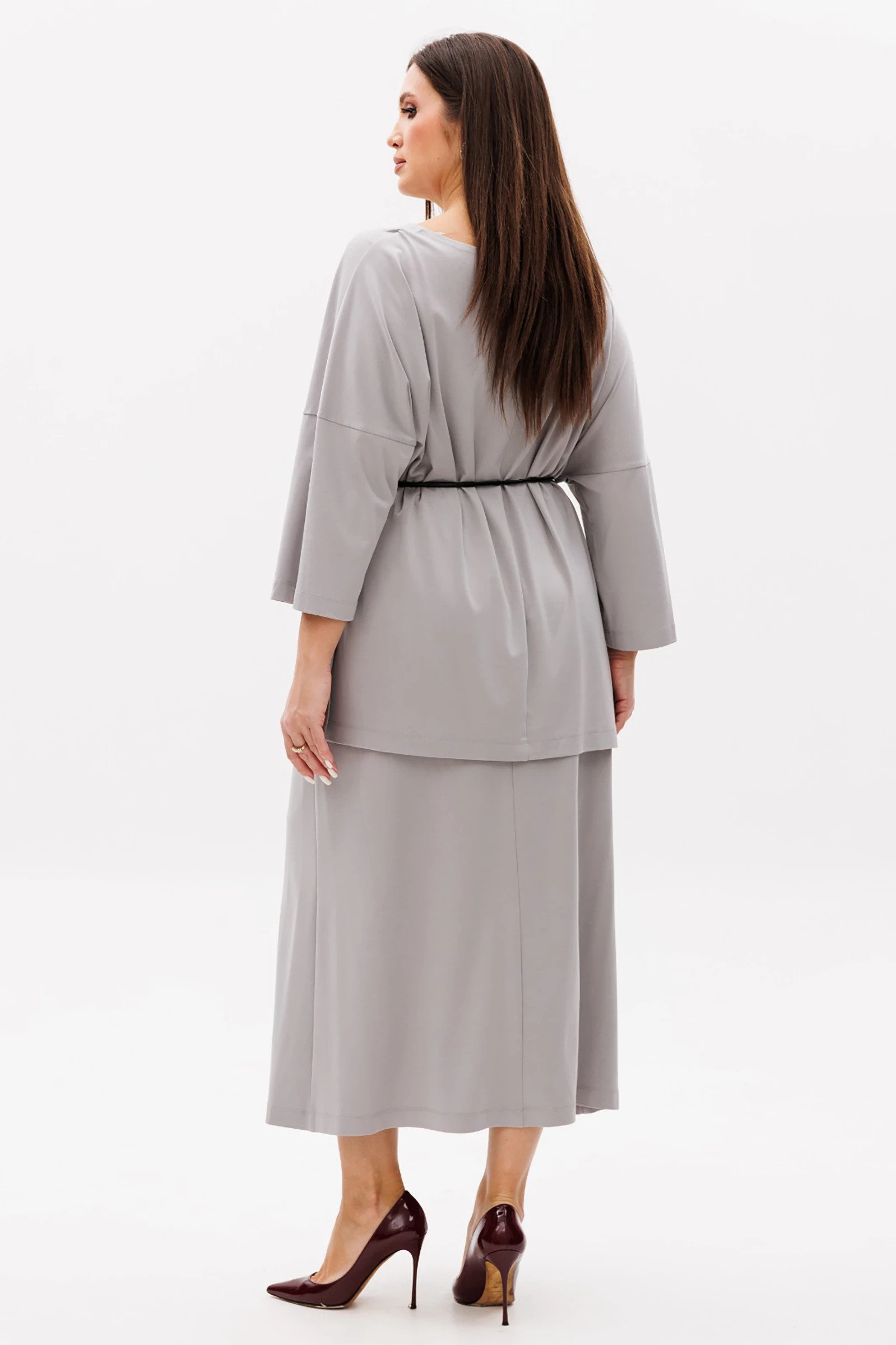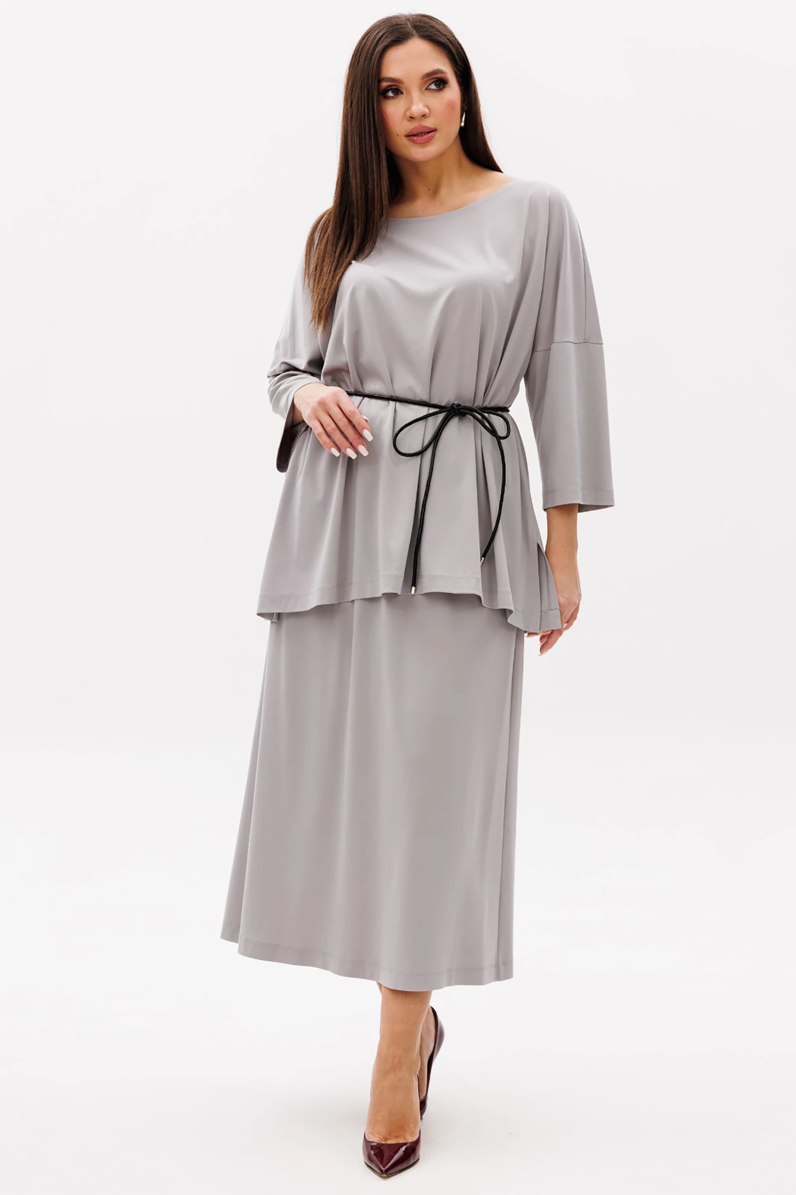 Свободная блуза сложного комбинированного покроя с фигурным низом и эффектными разрезами. Рукав длиной 3/4. Юбка-рыбка, на эластичном поясе, с застежкой на потайную молнию в боковом шве. Модель дополнена кожаным поясом-шнуром.