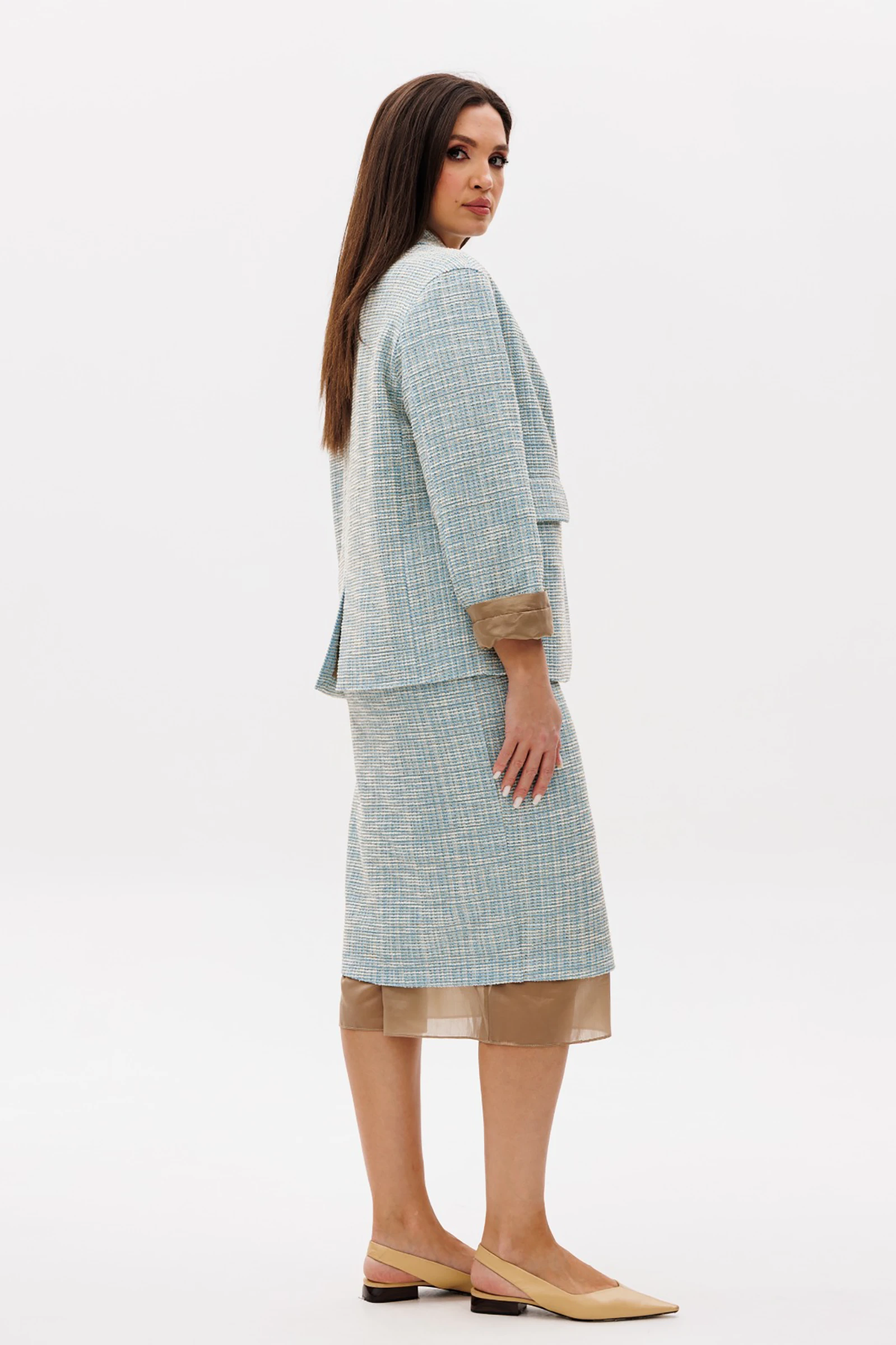 Жакет полностью на подкладке. Юбка прямая, на притачном поясе эластичном в области спинки. Переднее полотнище юбки с центральным швом и разрезом. Заднее-с талиевыми вытачками. По низу изделия отлетная деталь из полупрозрачной контрастной вуали, задающая определенную игривость всему образу.