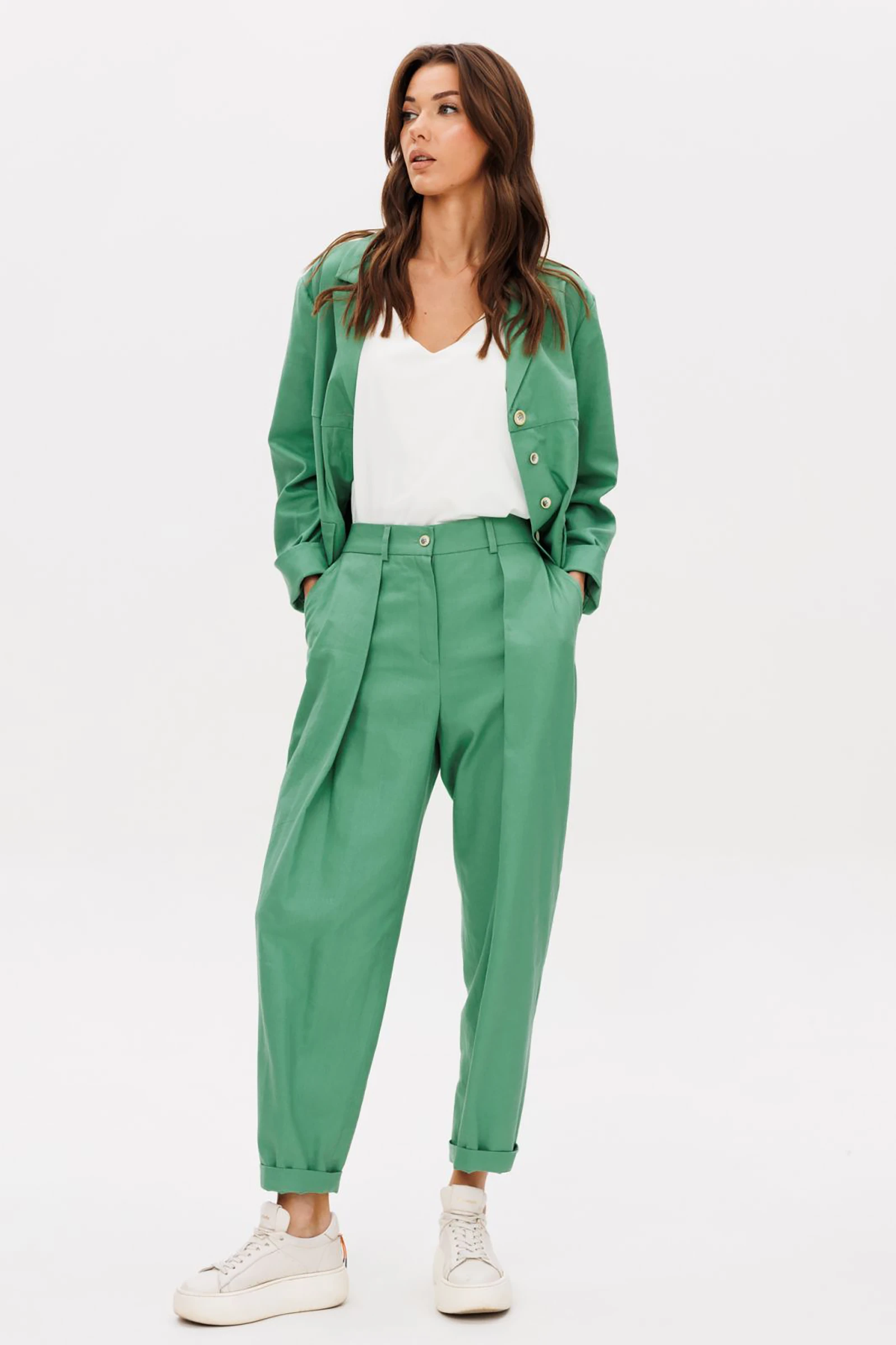 И невероятные брюки самого модного покроя "Barrel", на притачном поясе, эластичном в области спинки, наклонными боковыми карманами и глубокой складкой по передним половинкам.