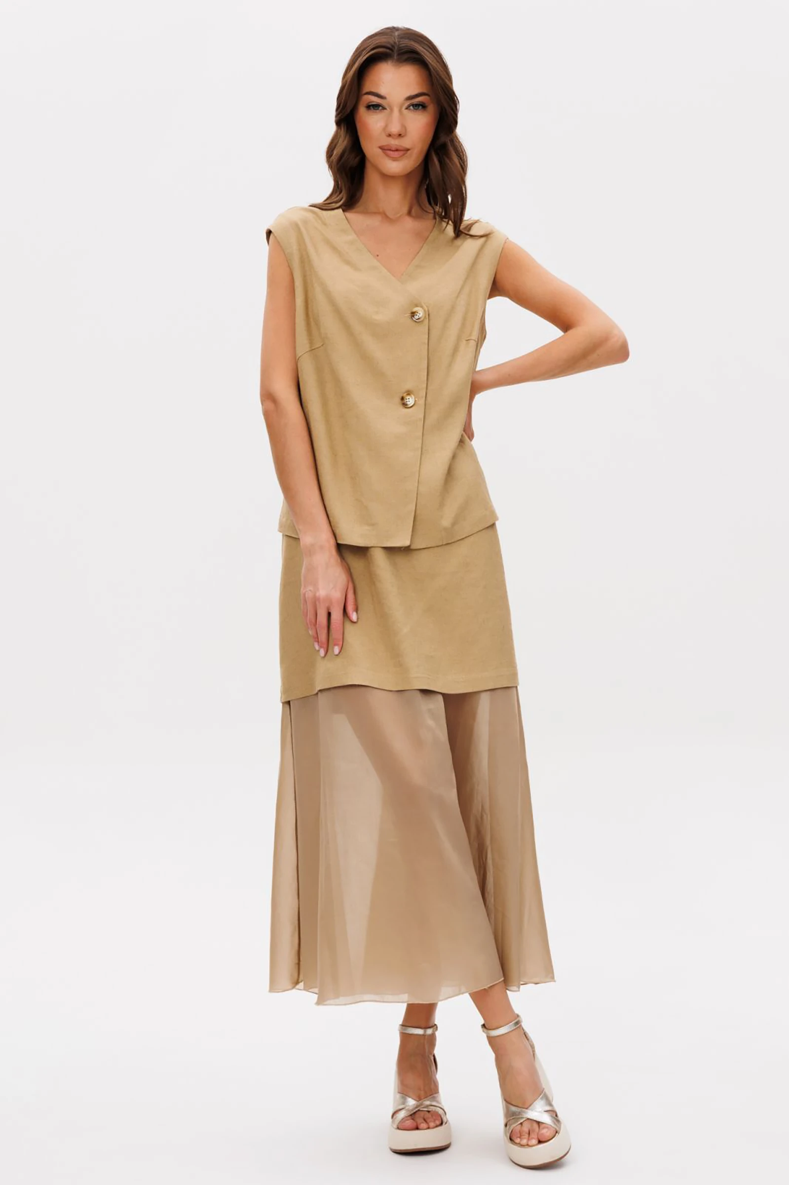 Жилет свободного покроя, средней длины с асимметричной застежкой. Полочка с нагрудной вытачкой.
