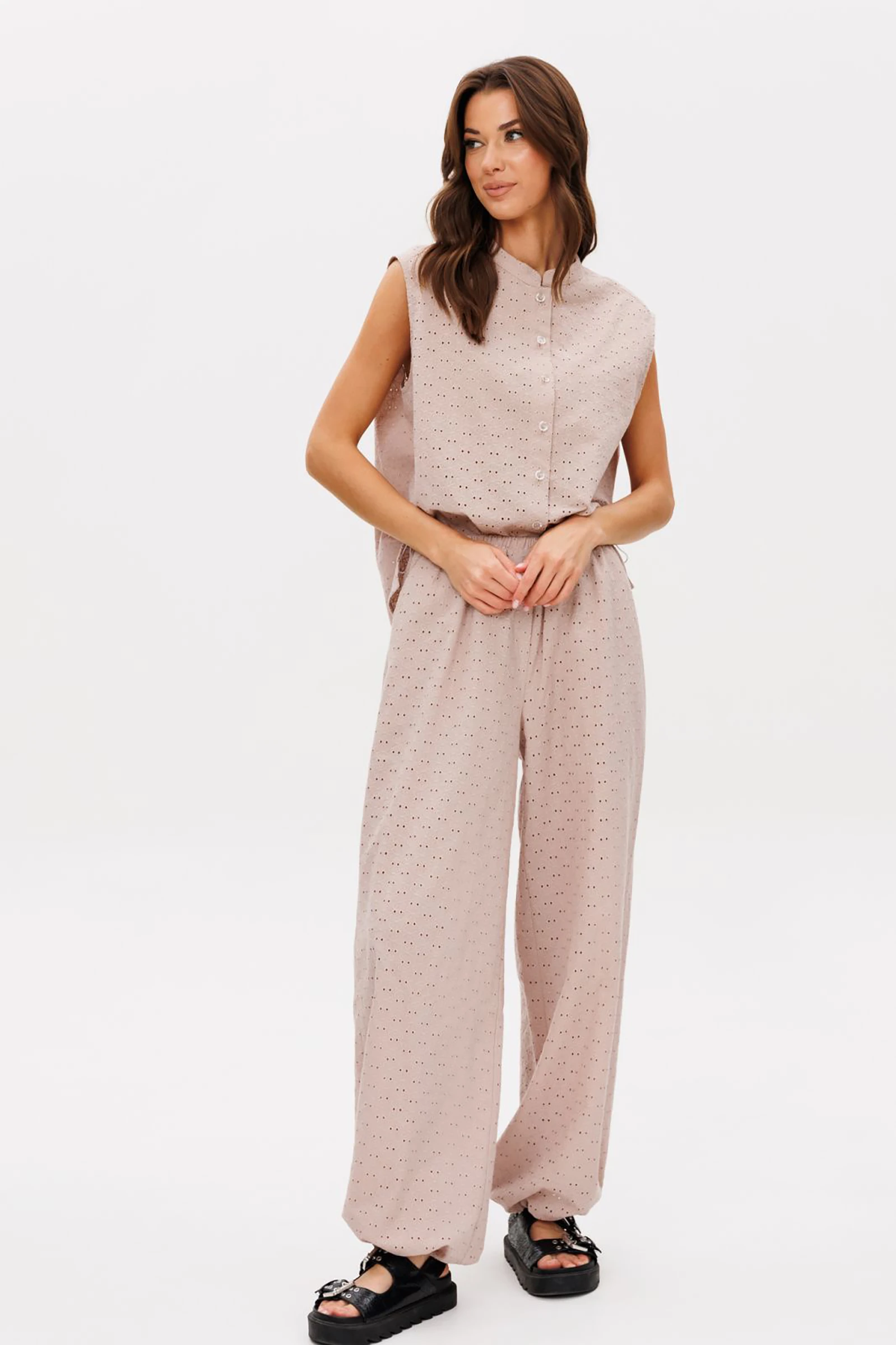 Нежный костюм из хлопкового шитья в мягком бежевом оттенке. Идеальный вариант для ваших красивых каникул. Шитье вернулось к нам в новом прочтении, таким оно еще никогда не было.