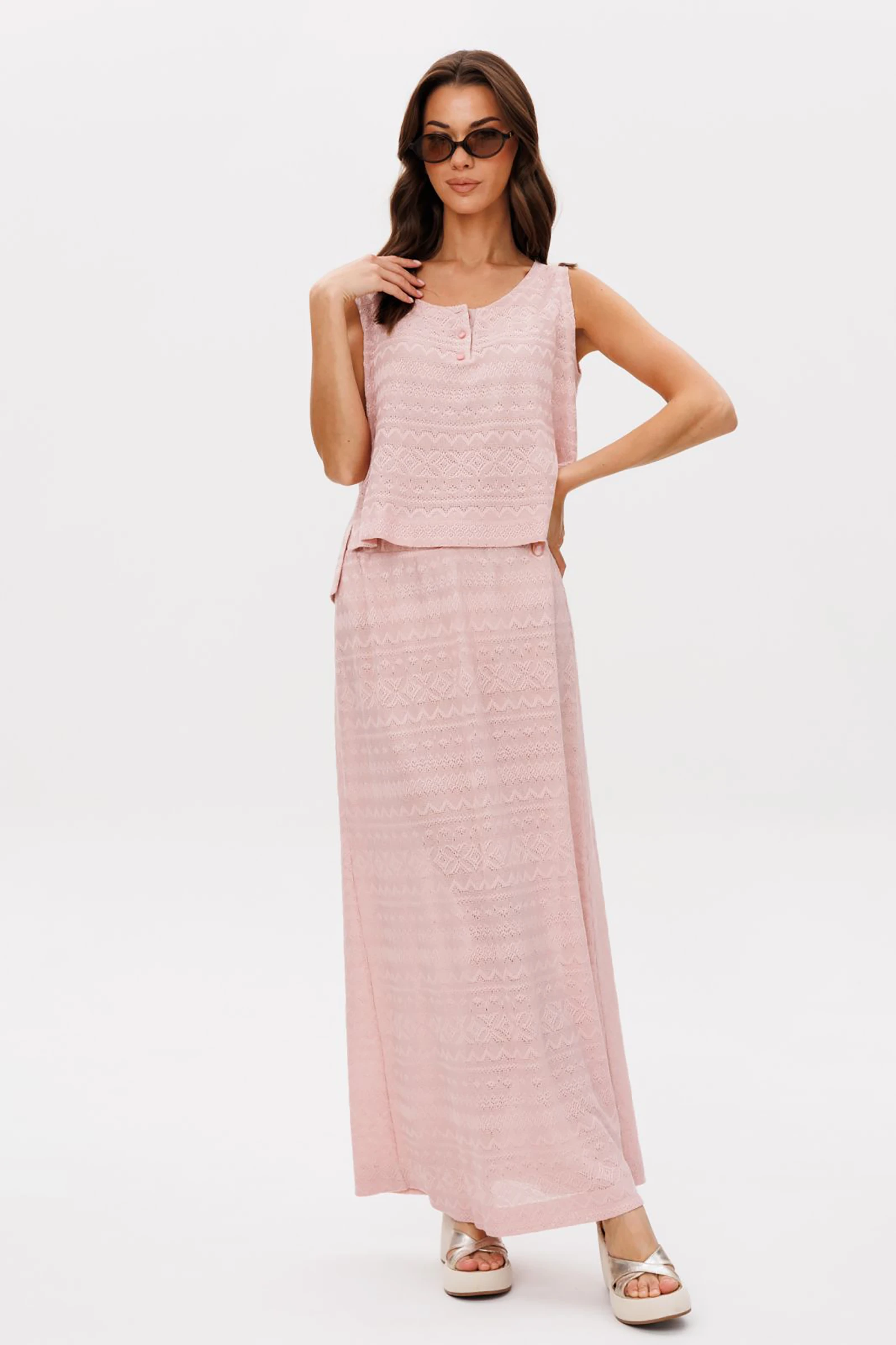 Умопомрачительный трикотажный комплект в котором захочется провести все самые жаркие месяцы лета. Невероятный состав полотна: хлопок и вискоза, плюс очень красивое ажурное плетение, словно фантазийные узоры связанный крючком, легкое и очень комфортное.