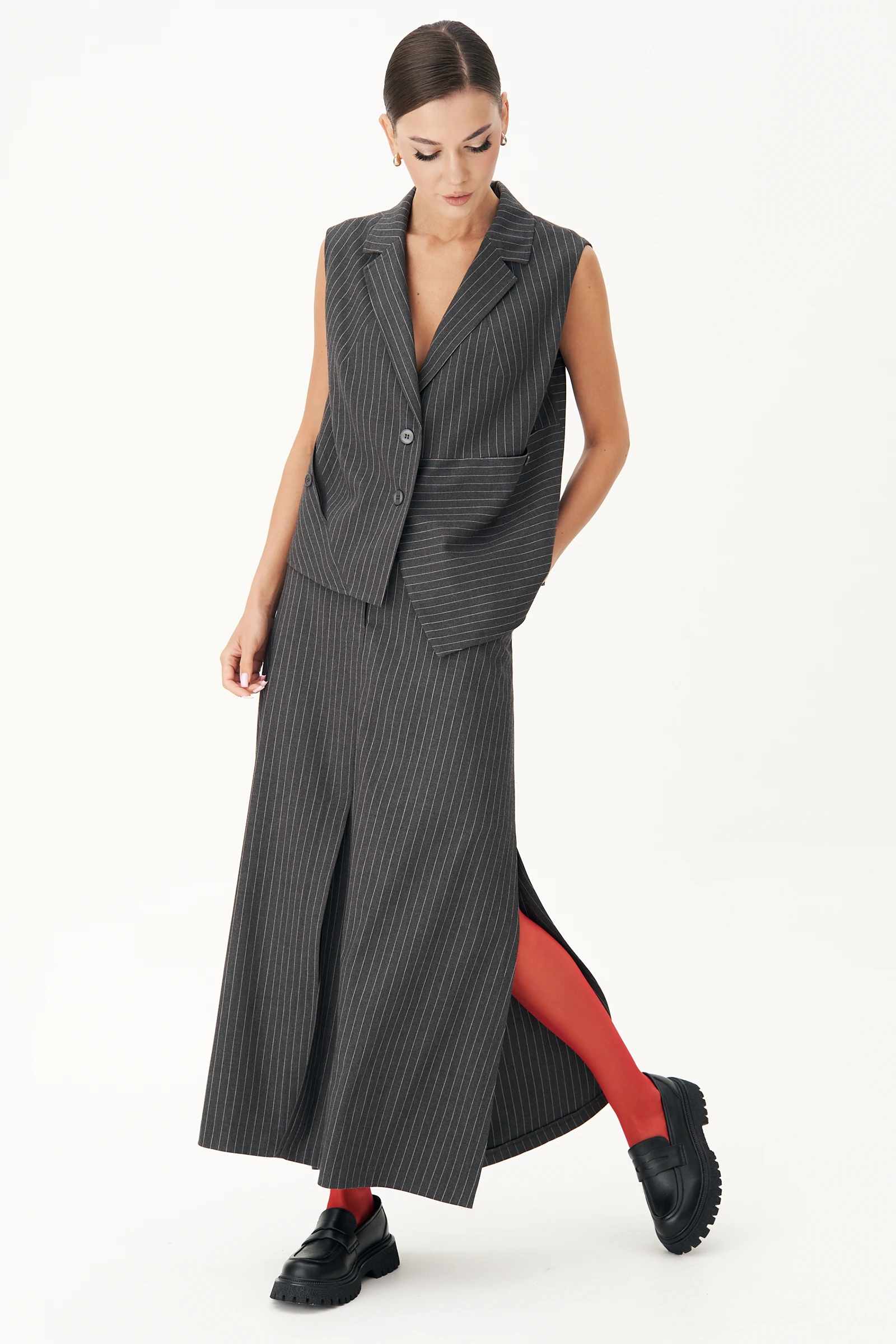Костюм с жилетом - прекрасное решение для смелых экспериментов. Выполненный в ахроматической цветовой гамме, он позволяет дополнять себя различными аксессуарами и создавать каждый раз новые актуальные образы. Жилет прямого силуэта с центральной застёжкой и фигурным разноуровневым бортом. Спинка с декоративной разноуровневой планкой, которая иммитирует застежку.Юбка А-образного силуэта с центральным швом с высоким разрезом по переднему полотнищу. Заднее полотнище с центральным швом, отрезной кокеткой, в швах которой карманы,и застёжкой на тесьму-молнию. Пояс отрезной с эластичной тесьмой по спинке. По боковым швам - наклонный карман.