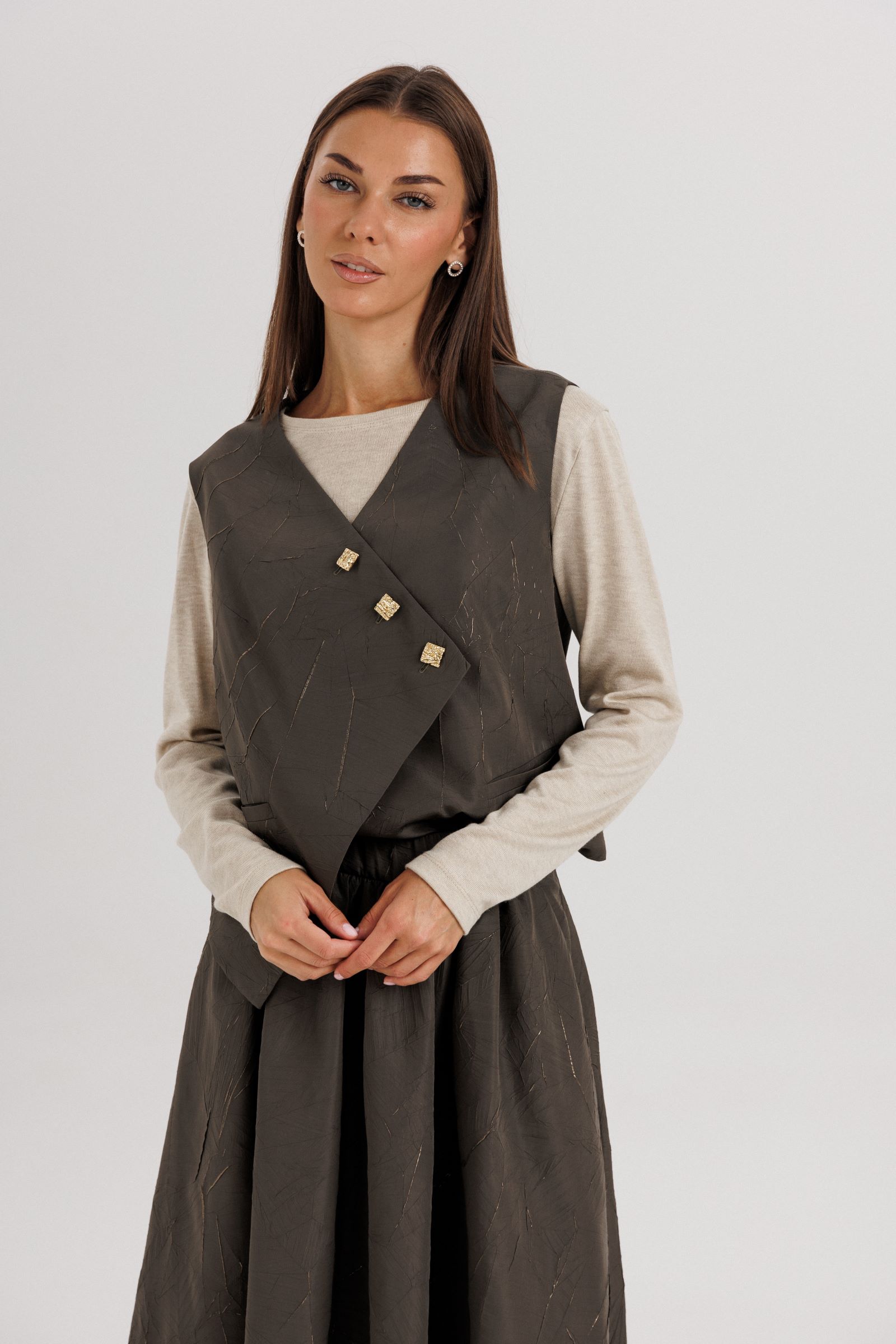 Жилет выполнен из плотной фактурной ткани с декоративной асимметричной застёжкой на пуговицы — этот элемент придаёт образу динамичность и оригинальность. Юбка длиной миди с мягкими складками красиво драпируется и подчеркивает женственность силуэта. Лонгслив из мягкого трикотажа обеспечивает комфорт и добавляет легкости всему ансамблю.