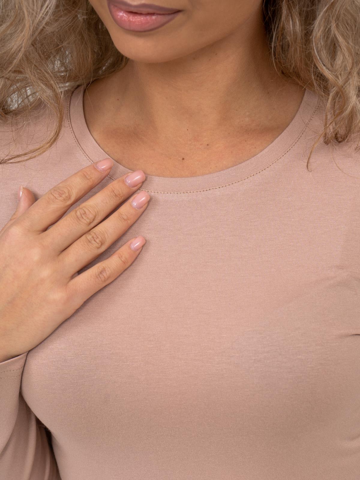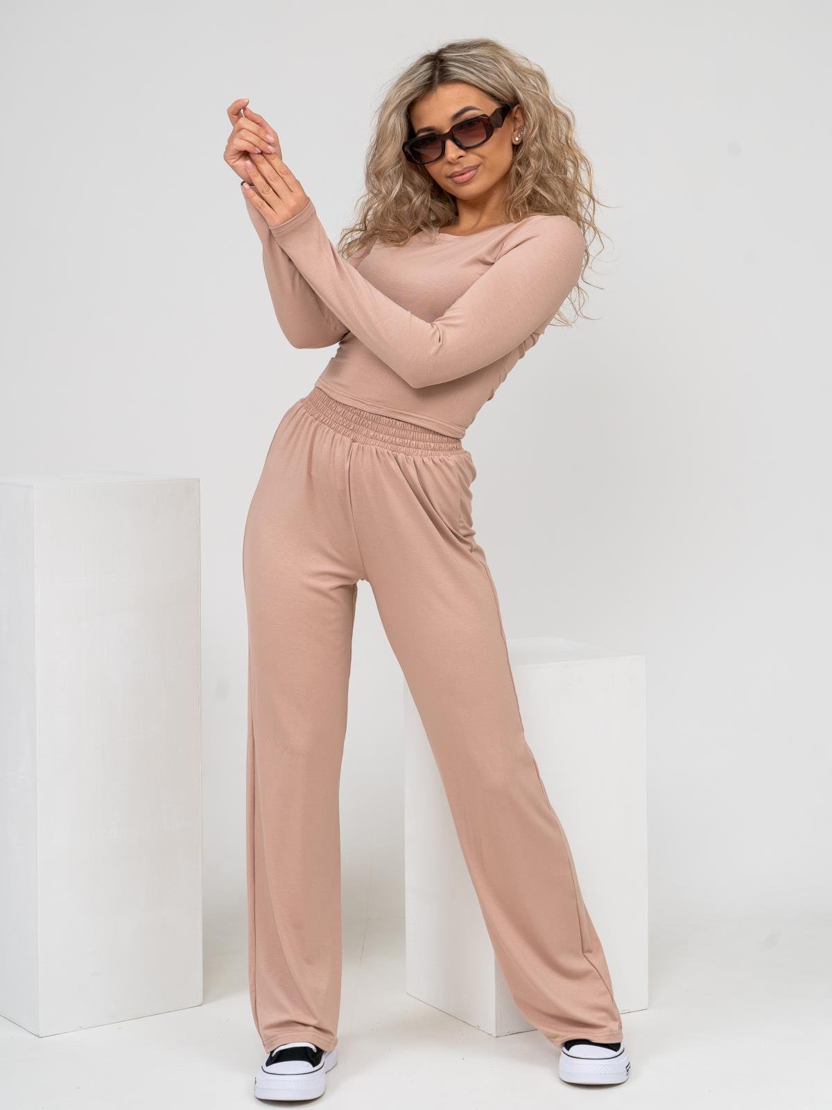 Костюм женский из трикотажа. Облегченный комплект состоит из укороченного лонгслива с округлым воротником и втачным рукавом, а также брюк - палаццо, свободного силуэта с поясом на резинке.