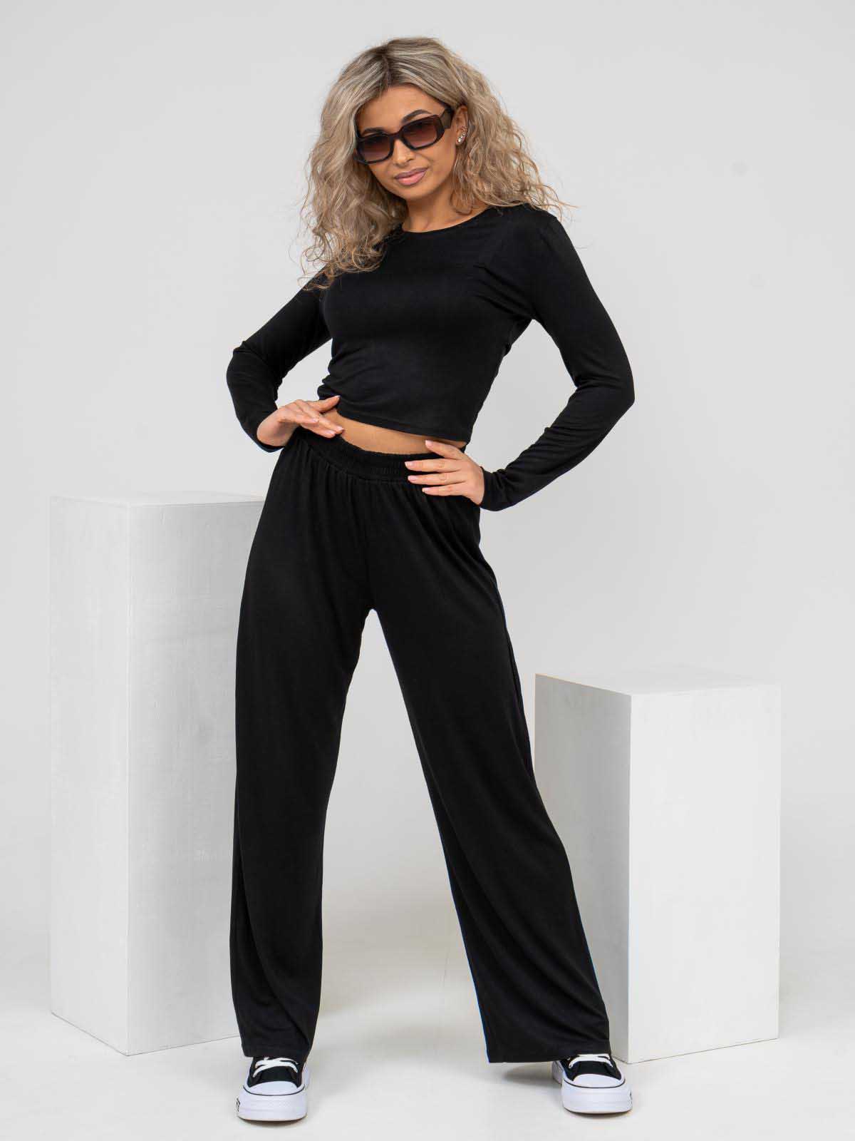 Костюм женский из трикотажа. Облегченный комплект состоит из укороченного лонгслива с округлым воротником и втачным рукавом, а также брюк - палаццо, свободного силуэта с поясом на резинке.