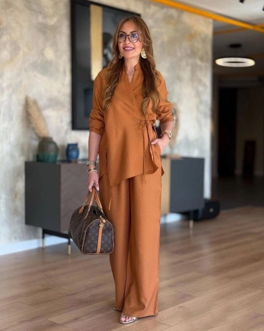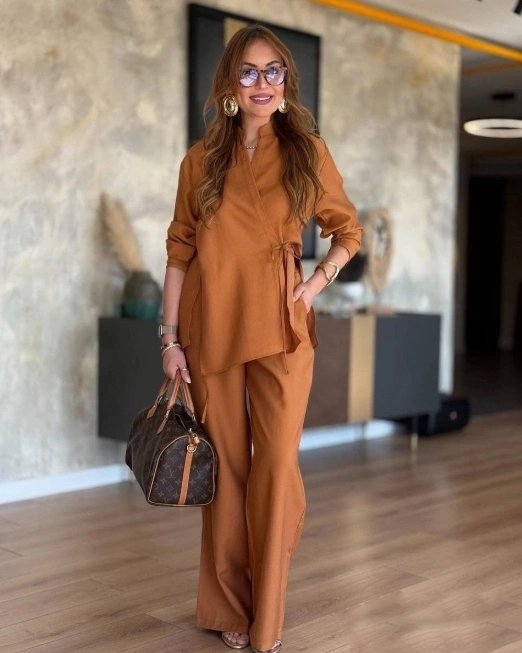 Костюм двойка – кофточка на запах и брюки.