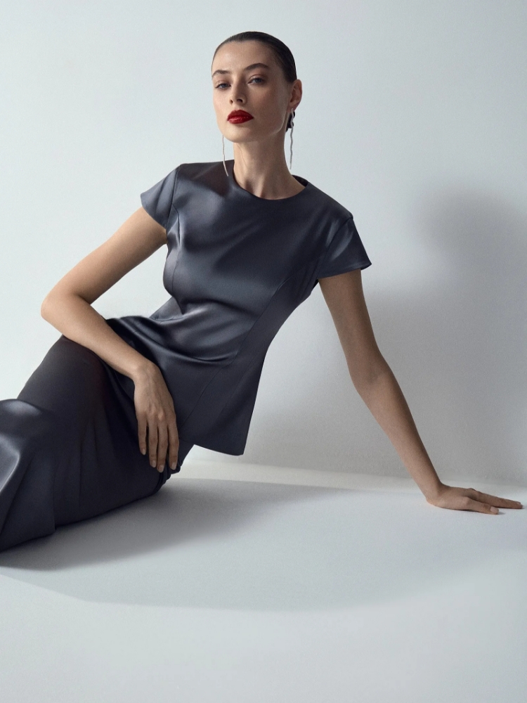 Эта элегантная блуза создаст благородный образ к любому случаю. Она выполнена из плотного атласа и отлично садится по фигуре. Благодаря высокой доле ацетата в составе блузка не мнётся и не электризуется. Также материал обладает эластичностью. Приталенная модель с намёком на баску и изящными вытачками формирует грациозный силуэт. Визуально вытягивает, грамотно подчёркивает женственный контраст между талией и бёдрами. Эффектный графитово-стальной оттенок с глубиной и блеском производит сильное впечатление. Такая вещь одинаково хороша и в офисе, и на корпоративе, и на свидании, подойдёт для выхода в театр или встречи с подругами. Завершить образ можно юбкой из комплекта. Ансамбль станет ядром базового гардероба в стиле современной классики