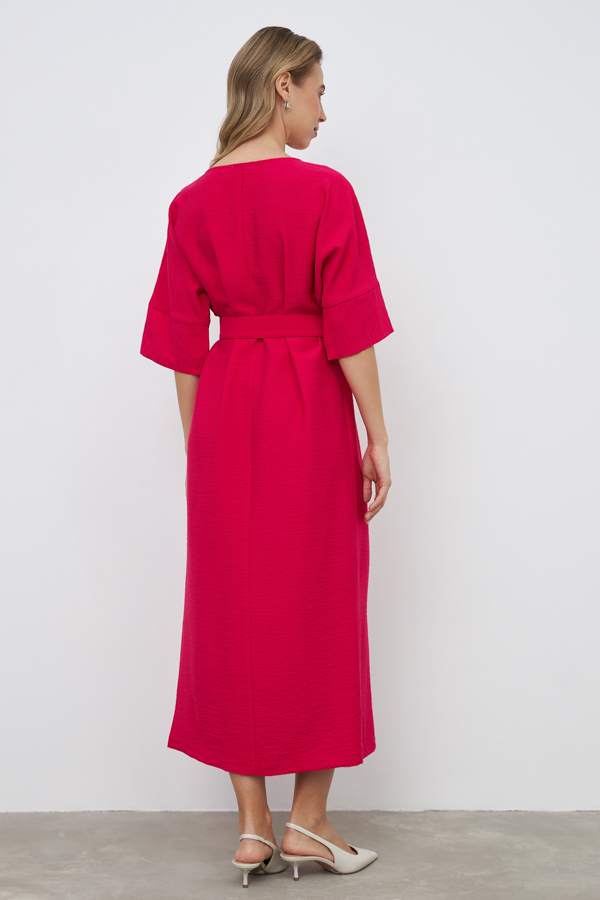 Платье из вискозной ткани с крэш-эффектом. Свободный силуэт, с разрезом в боковом шве. Круглый вырез горловины окантован косой бейкой из основной ткани. Цельнокроеный рукав с притачной манжетой. В комплекте пояс из основной ткани. В таблице размеров представлены параметры человека, а не изделия.