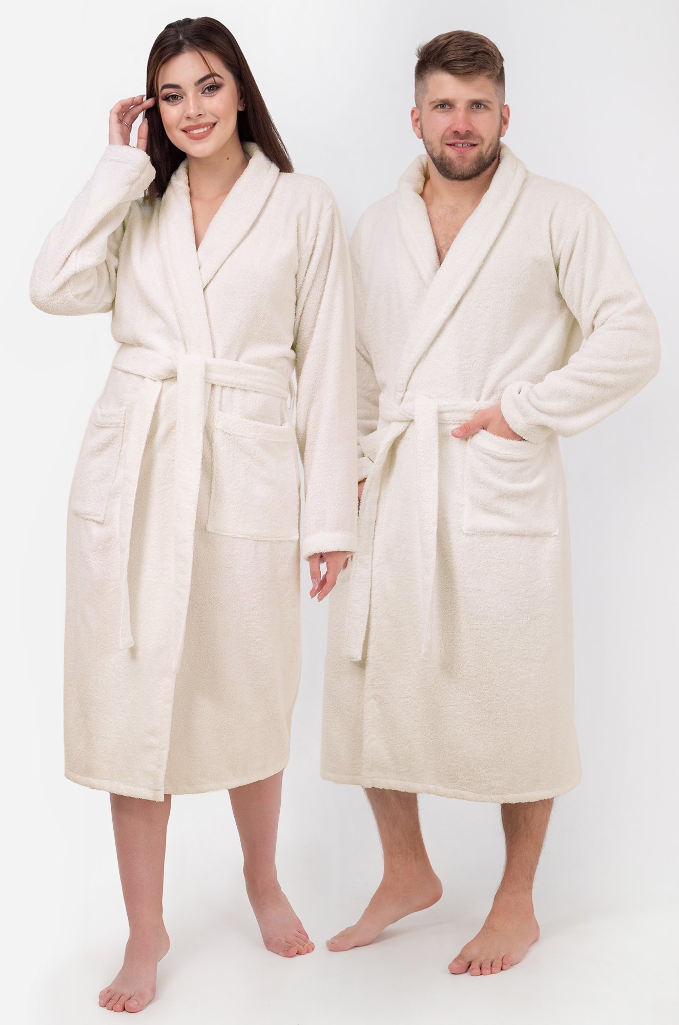 Банный кремовый халат выполнен из 100% хлопка. Длинные рукава, крой на запах, пояс в комплекте, накладные карманы – каждая деталь разработана для вашего комфорта!