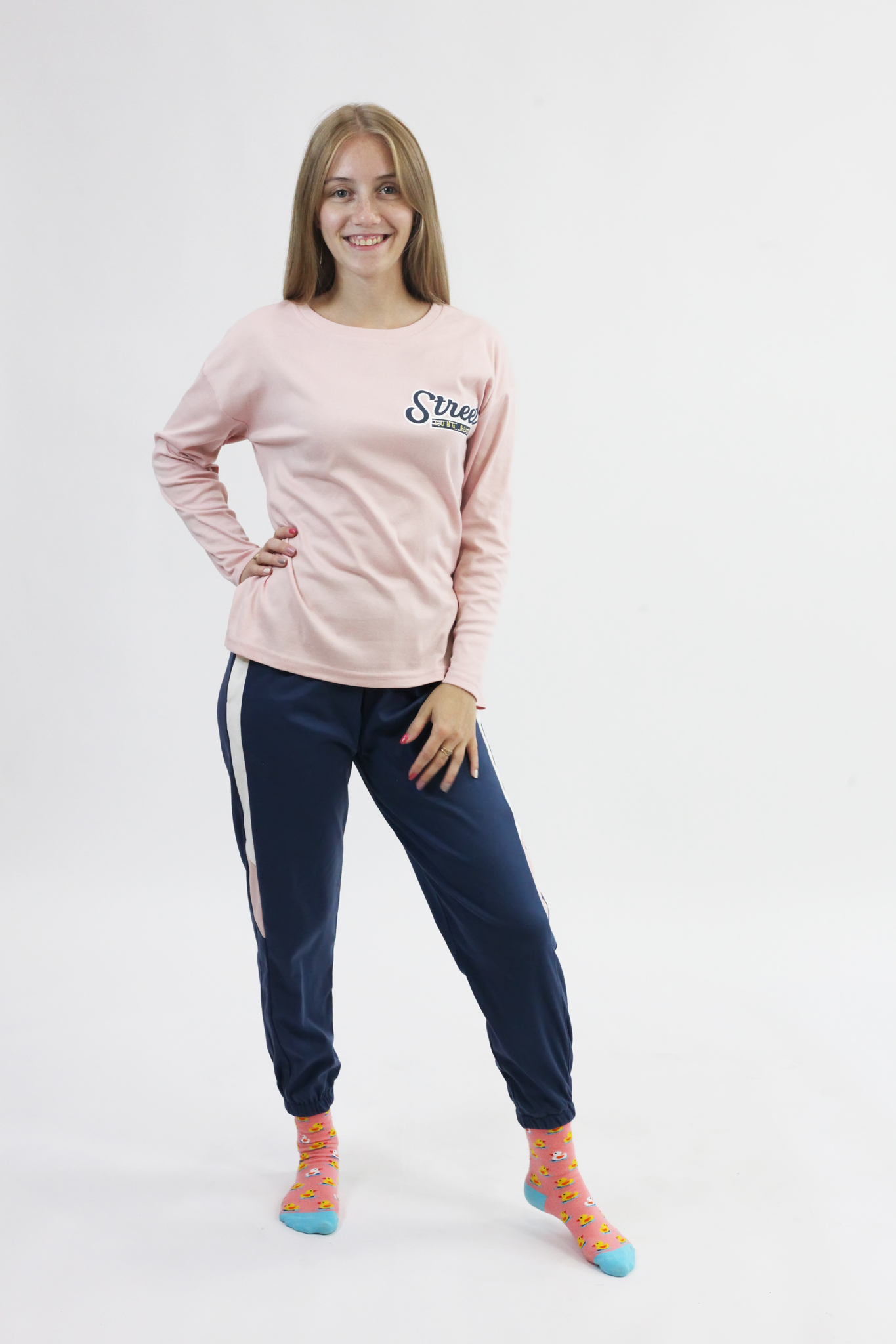 Принт: надпись Street, вставки белого и розового цвета на штанах