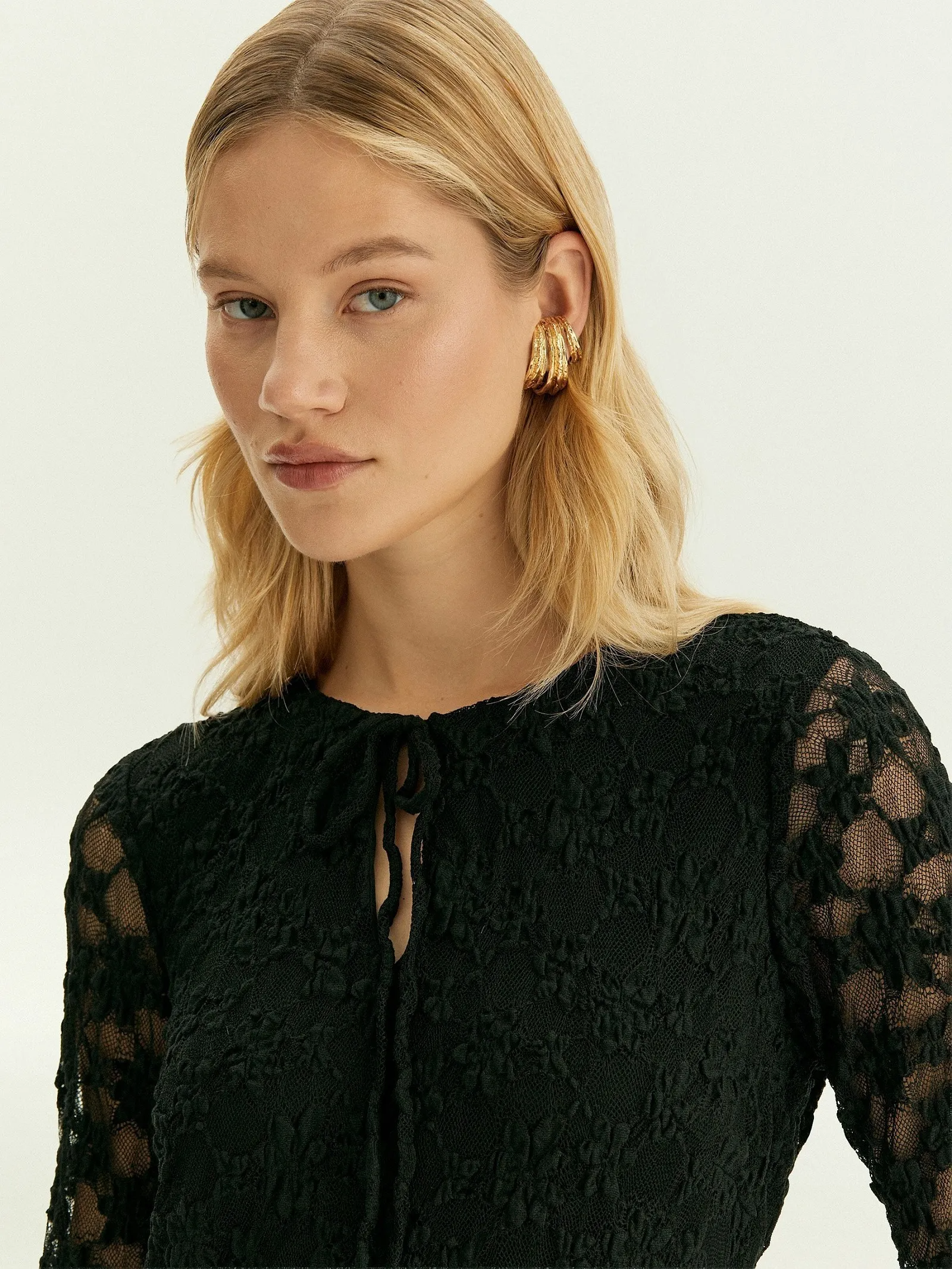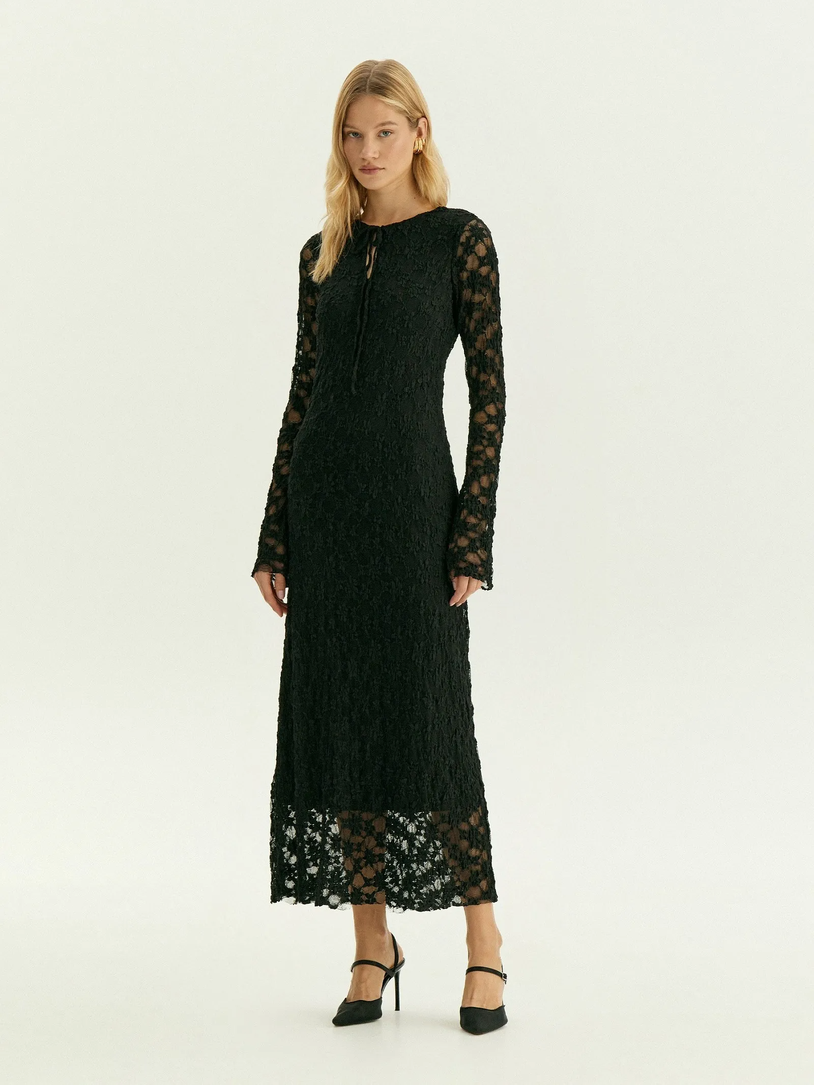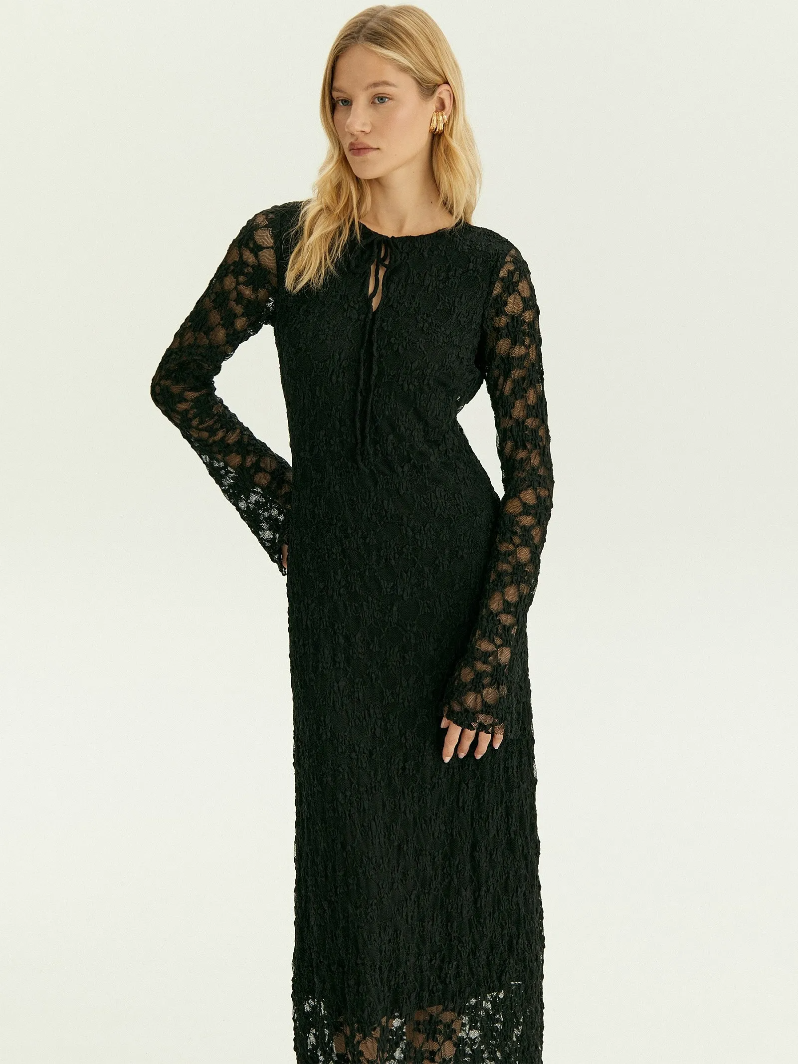 Облегающее кружевное платье макси с длинным рукавом — идеальный выбор, когда хочется выглядеть максимально женственно. Чёрный цвет добавляет образу таинственности и уверенности. Кружево наполовину состоит из натурального хлопка, содержит эластан для комфортной посадки по фигуре и нейлон для износостойкости. Прозрачный верхний слой дополнен подкладкой. Модель сделана без застёжек.