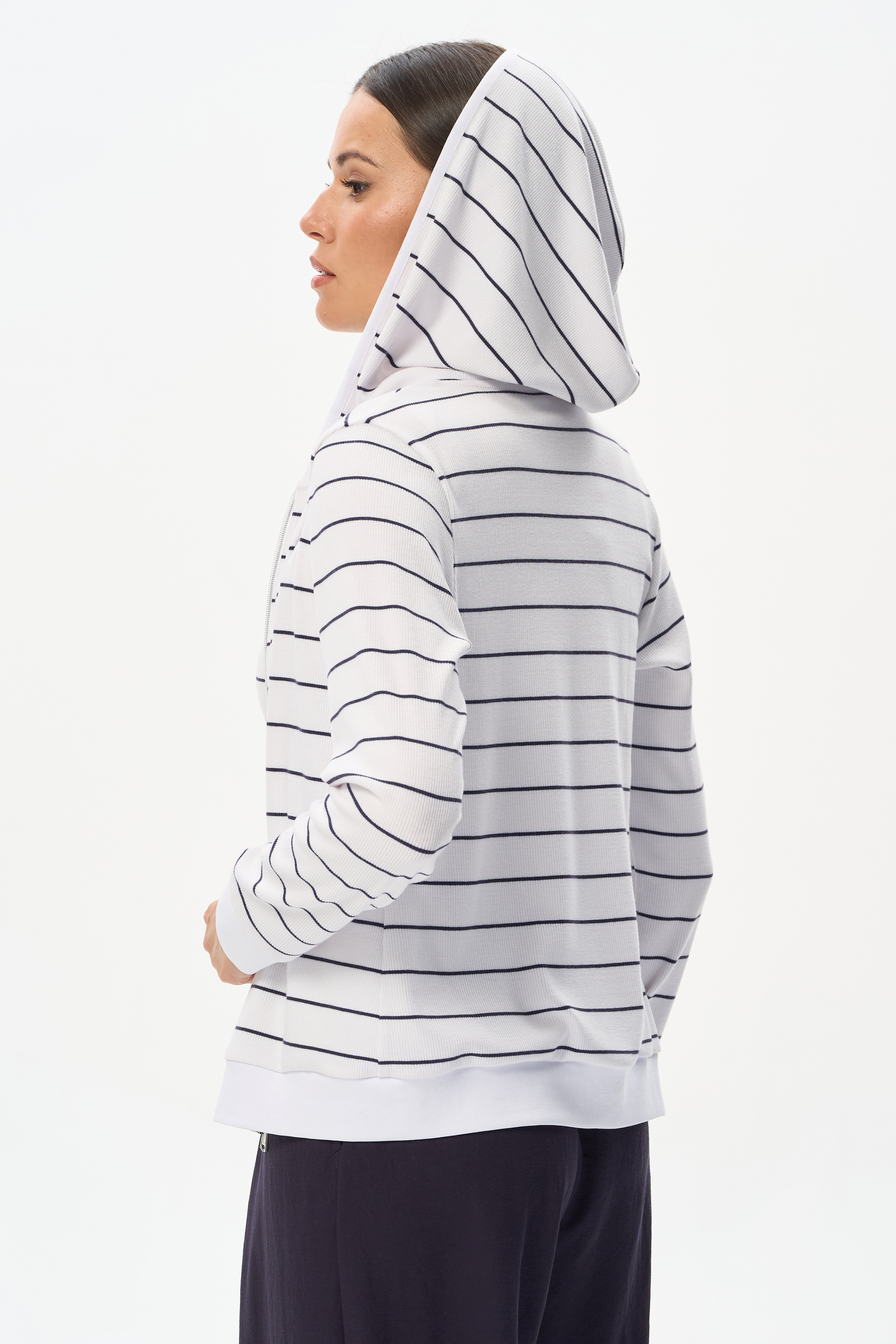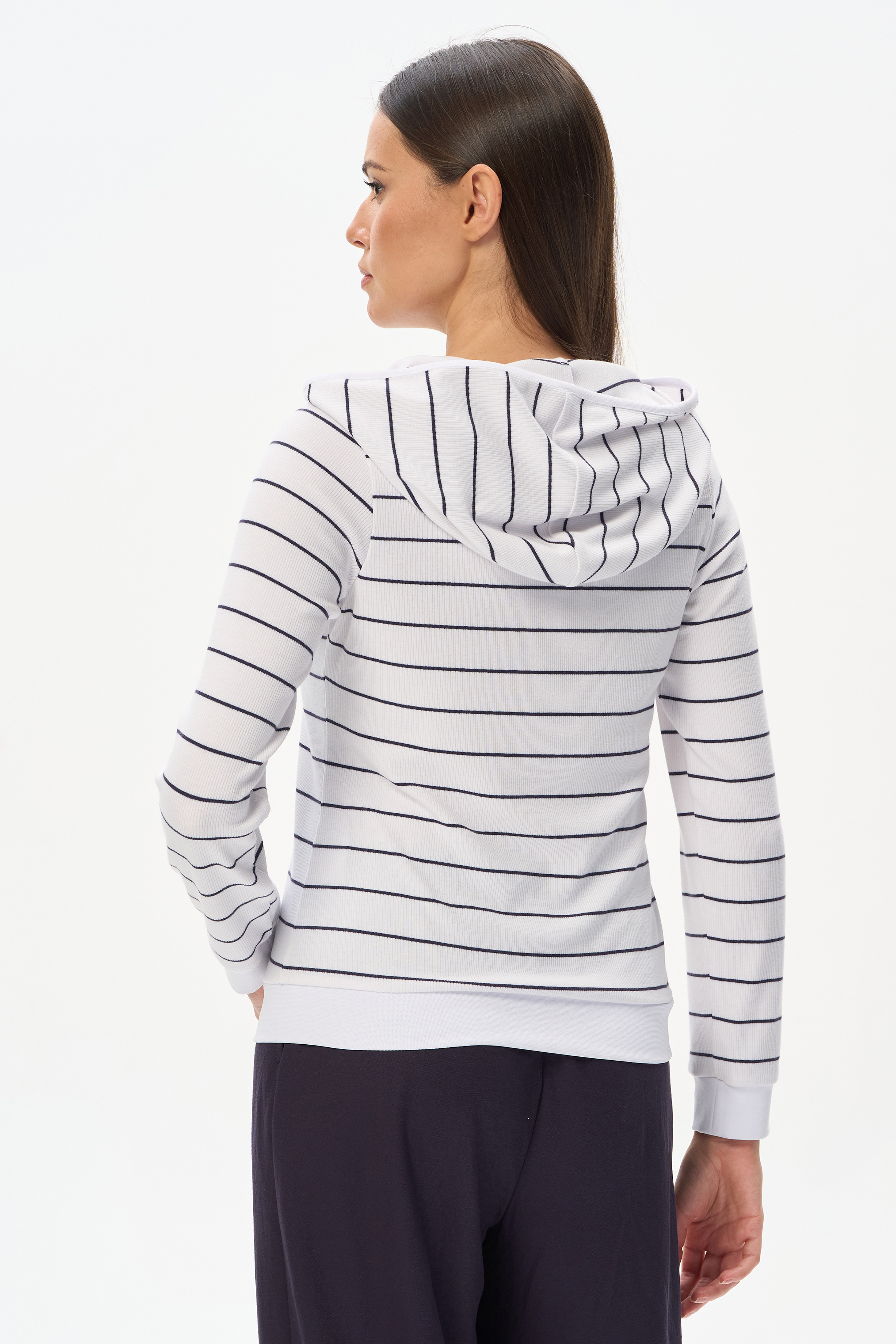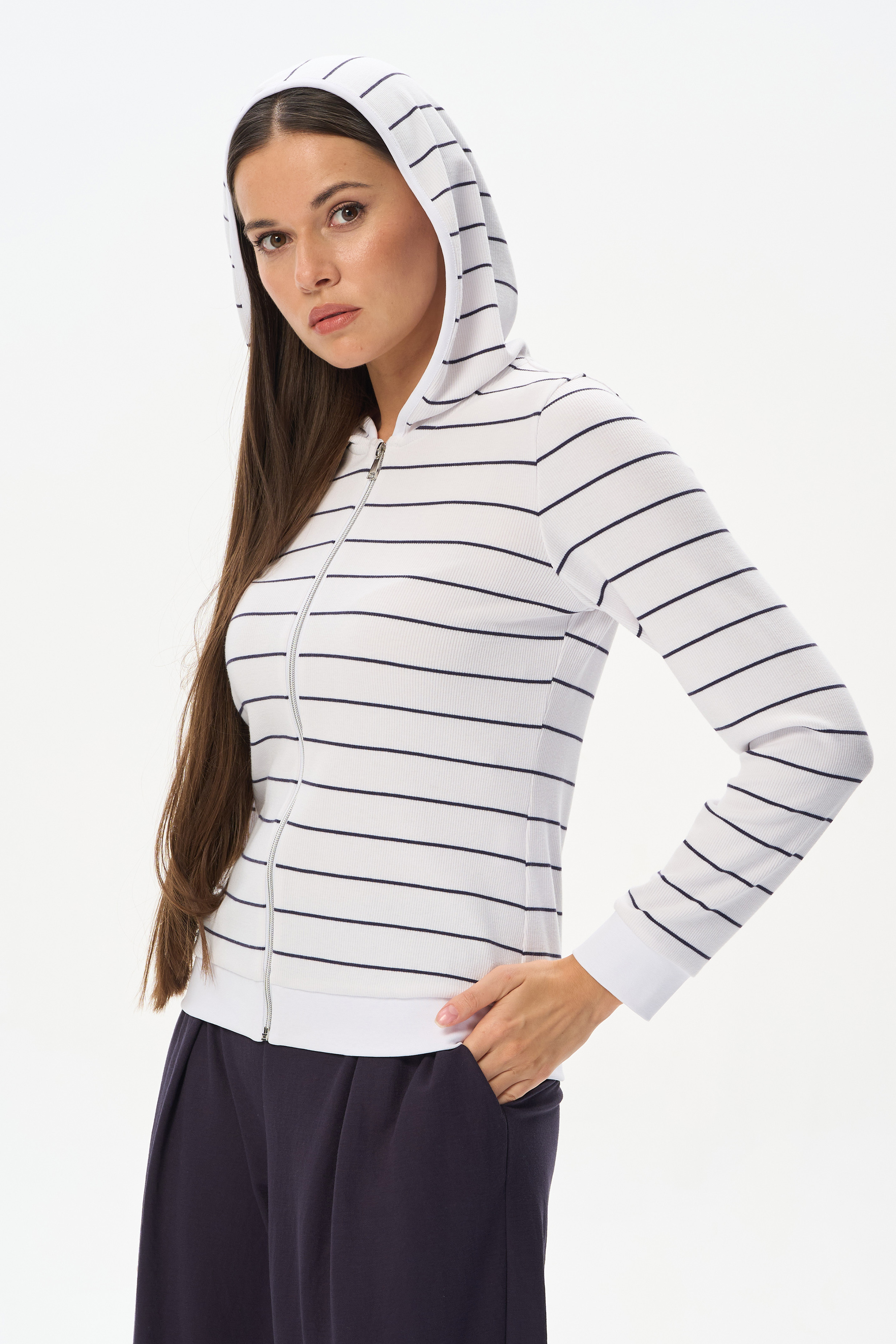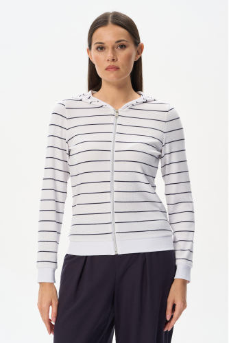 75% вискоза, 25% полиэстер Куртка из вискозного кашкорсе в бело-синюю тонкую полоску с добавлением ПЭ для придания лёгкости полотну и формоустойчивости. Модель небольшого объёма, застёжка на молнию и капюшоном, рукава длинные. Низ изделия и манжеты из мягкой рибаны. Благодаря составу полотна куртка не только согревает и защищает от ветра, но и не мнется, поэтому незаменима в путешествии. Рост модели 175 см.