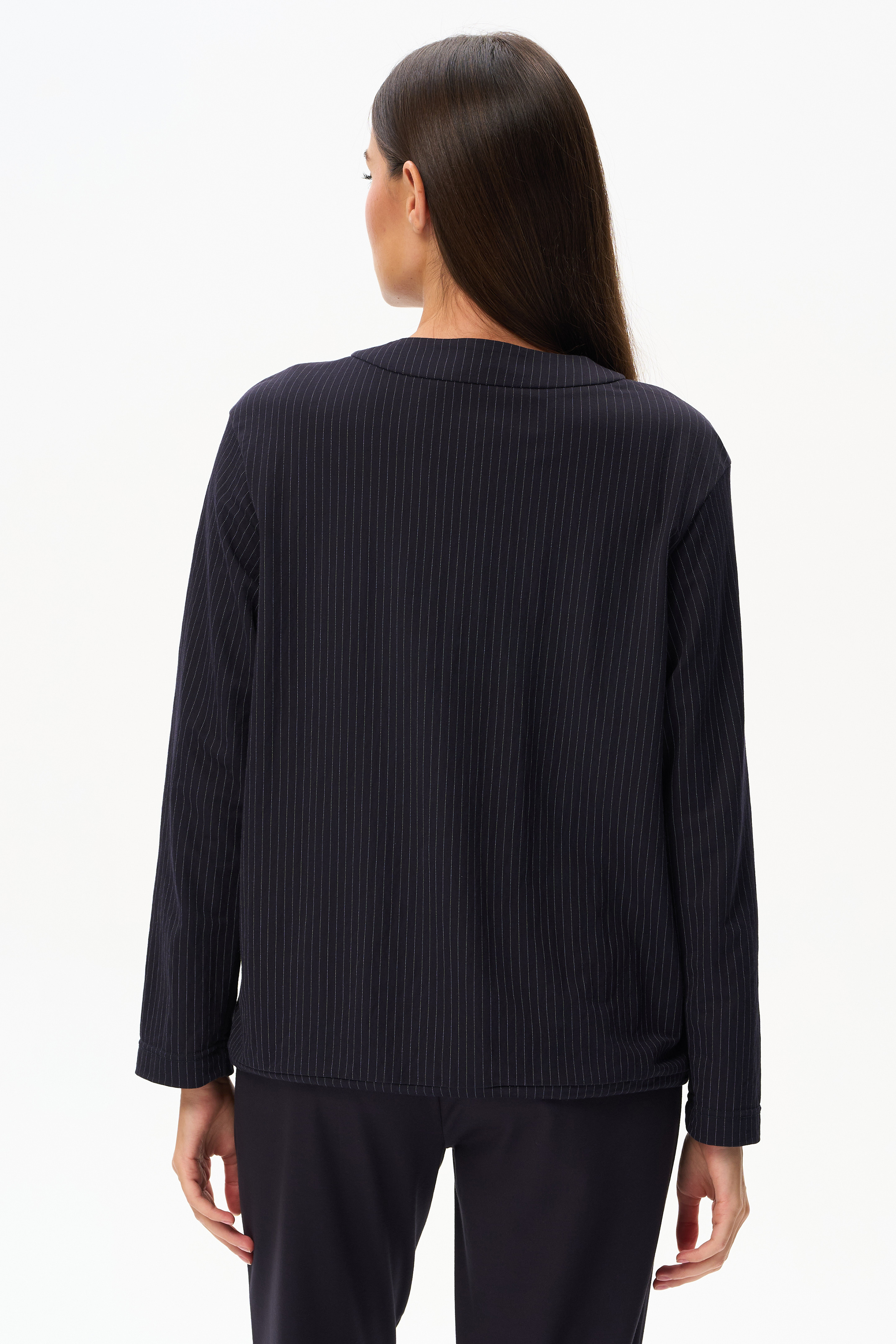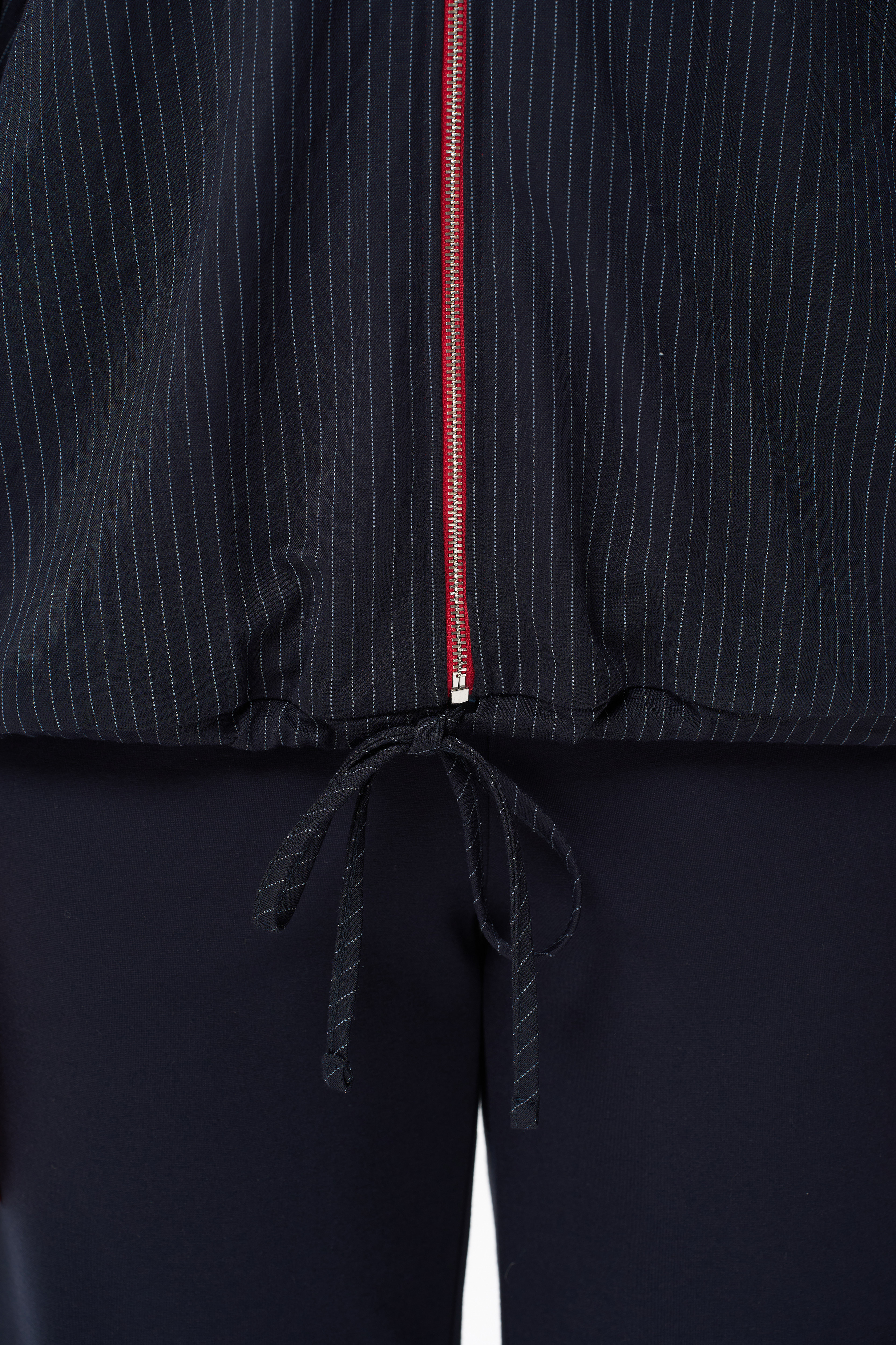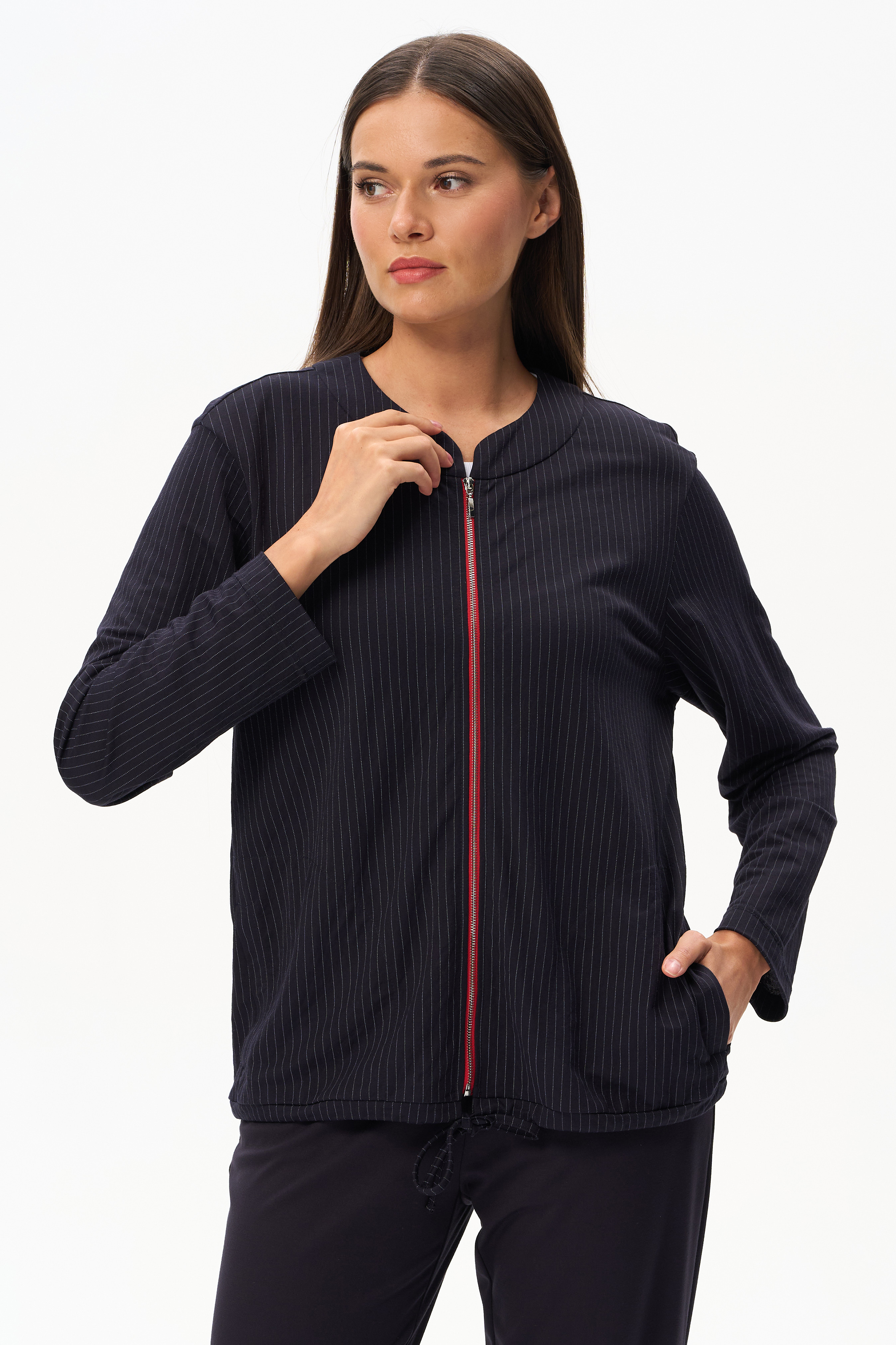 Лёгкая куртка из вискозного полотна 180 гр в глубоком синем оттенке с тонкой полоской. Модель свободная, прямого силуэта, длина закрывает бедра, регулируется кулиской по низу. Рукава длинные, карманы в боковых швах, застёжка на контрастную молнию в оттенке коллекции, по горловине стойка. Универсальная модель для внесезонного гардероба.