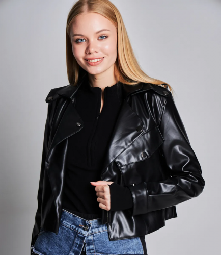 Куртка из эко-кожи классический вариант на очень этого сезона. Укороченная модель может сочетаться как с джинсами, так и с юбками разной длинны и кроя. Полиуретан