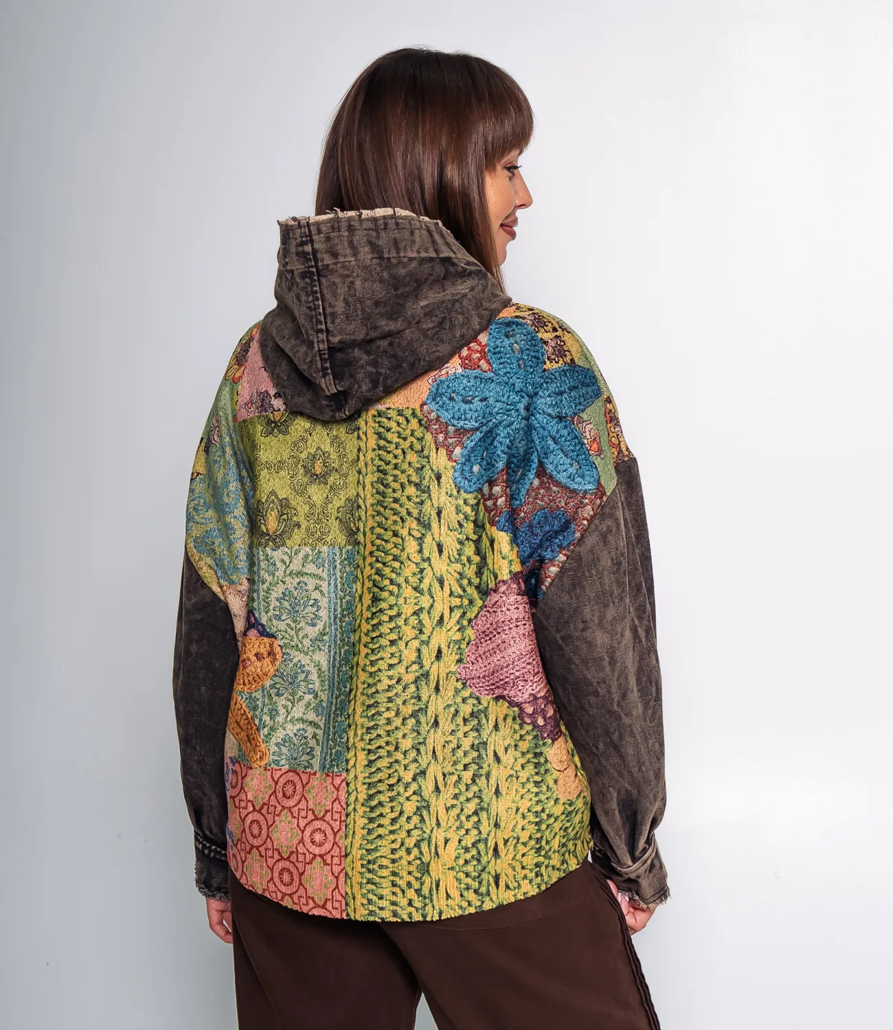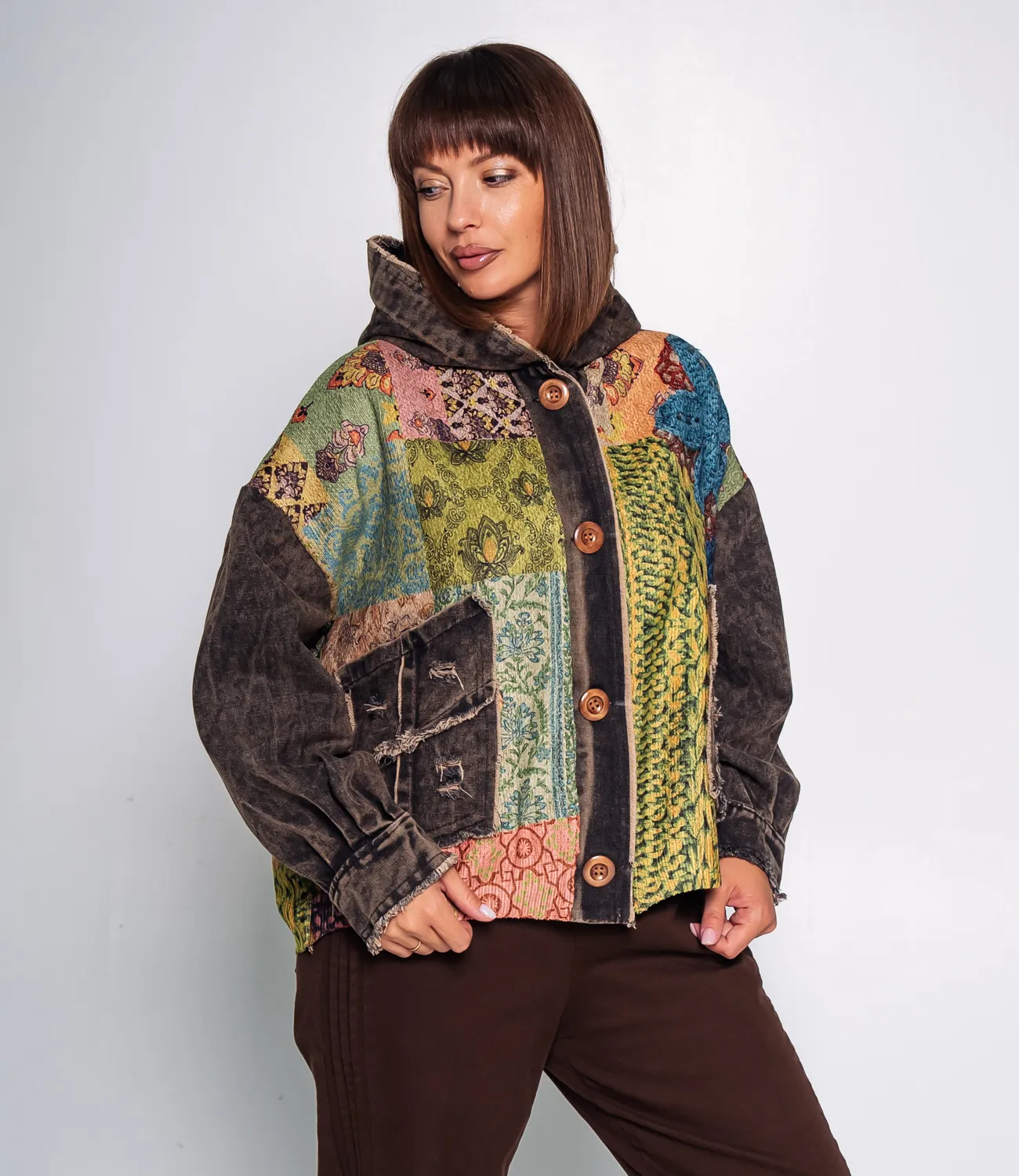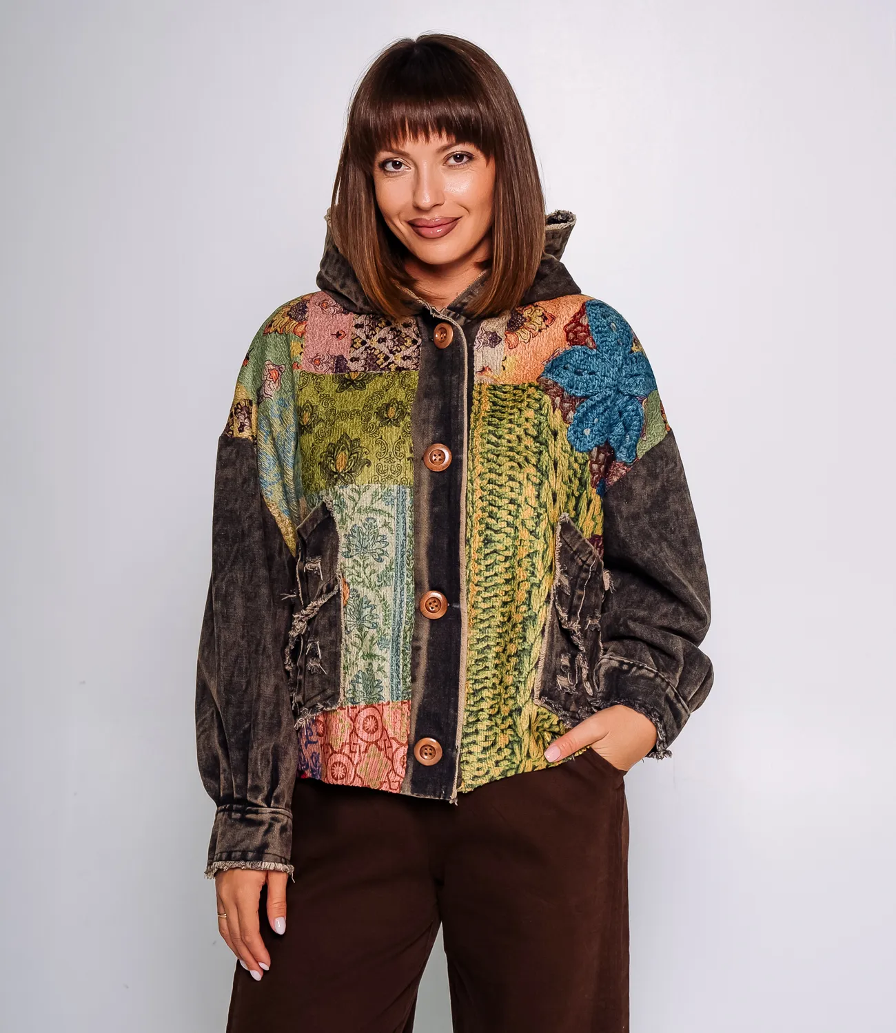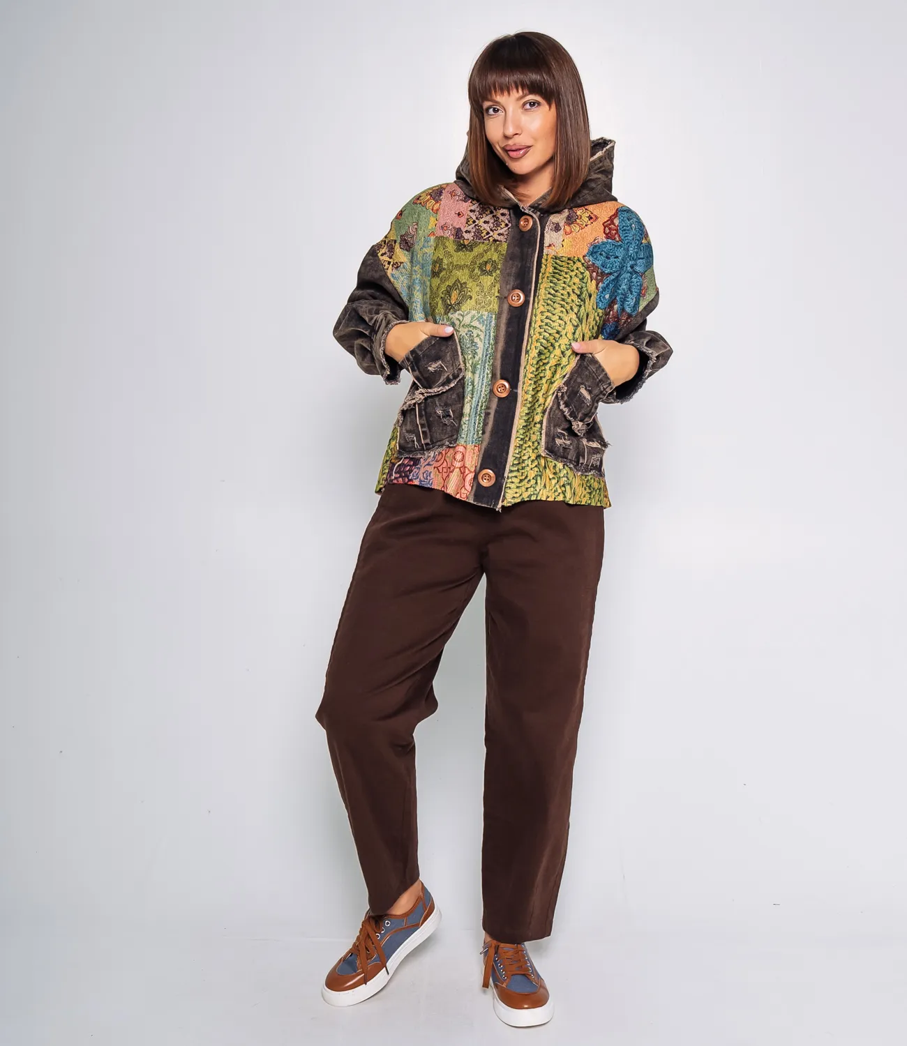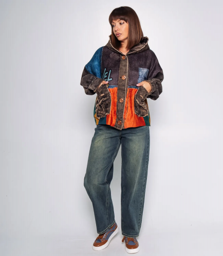 Куртка – это одежда, которая подчеркивает уникальность каждой представительницы прекрасного пола. Куртка имеет свободный крой с капюшоном и застёгивается на крупные деревянные пуговицы, что подчёркивает её стиль и практичность. Яркий мультиколорный принт с контрастными фактурами создаёт эффект многослойности и оригинальности. Центральная планка, рукава и карманы выполнены из ткани с эффектом потертости и бахромой, что добавляет образу неординарности и лёгкого винтажного шика. Куртка сочетает в себе комфорт и стиль, идеально подходит для прохладной погоды и подчёркивает индивидуальность владельца. Для изготовления использован 50% хлопок, 25% акрил, 25% полиэстер, который характеризуется отличным качеством. Даже после многократных стирок изделие не утратит первоначальной привлекательности. Вы обязательно будете его носить с радостью. Обратите внимание на цвет. Он является насыщенным и полностью соответствует фотографии на сайте. Чтобы вы были уверены в размере, мы представили на странице таблицу. Воспользовавшись ею, вы сможете сами обмерить себя и удостовериться. Установленная нами цена является приемлемой. Не откажите себе в удовольствии быть неповторимой!