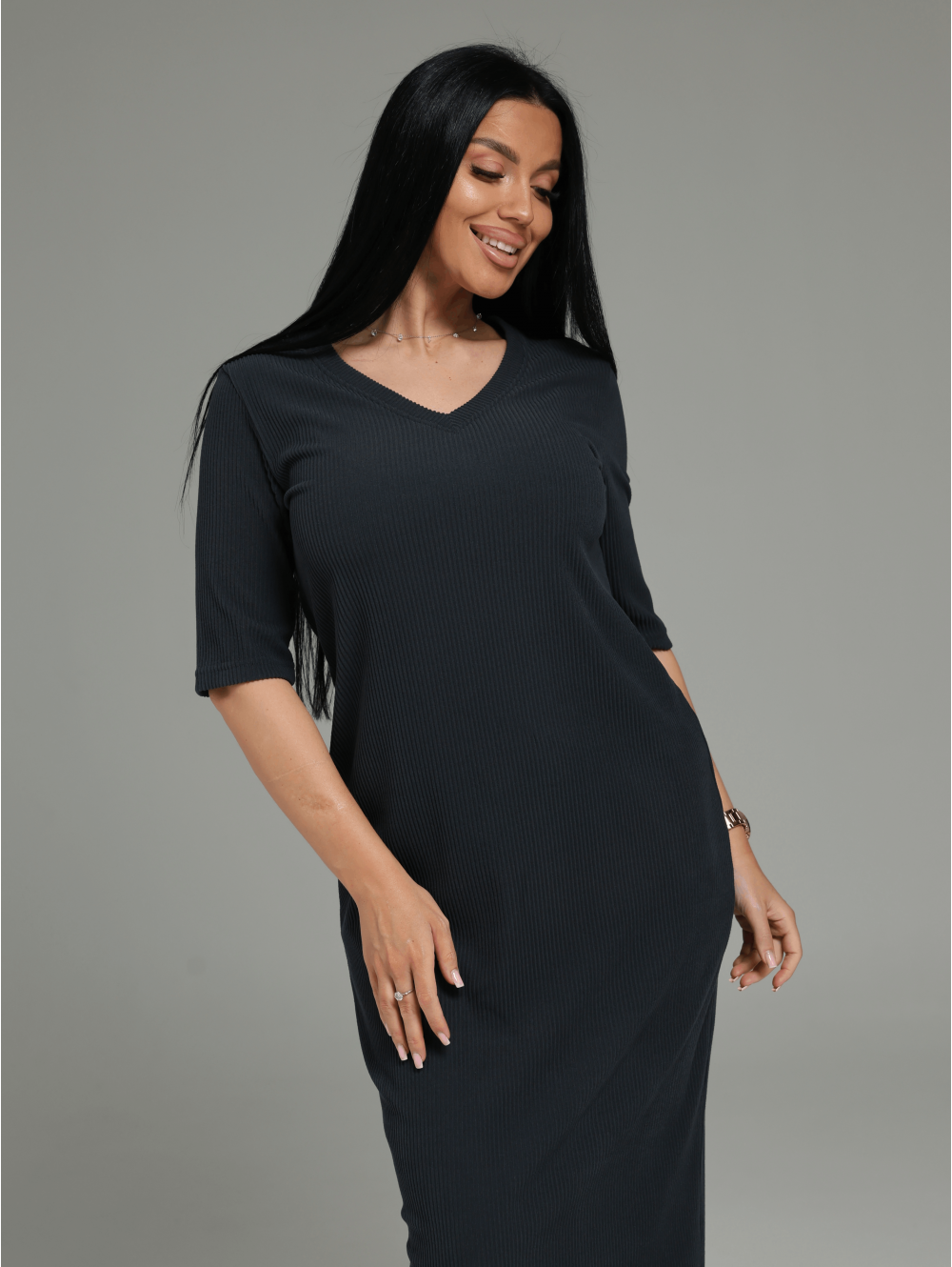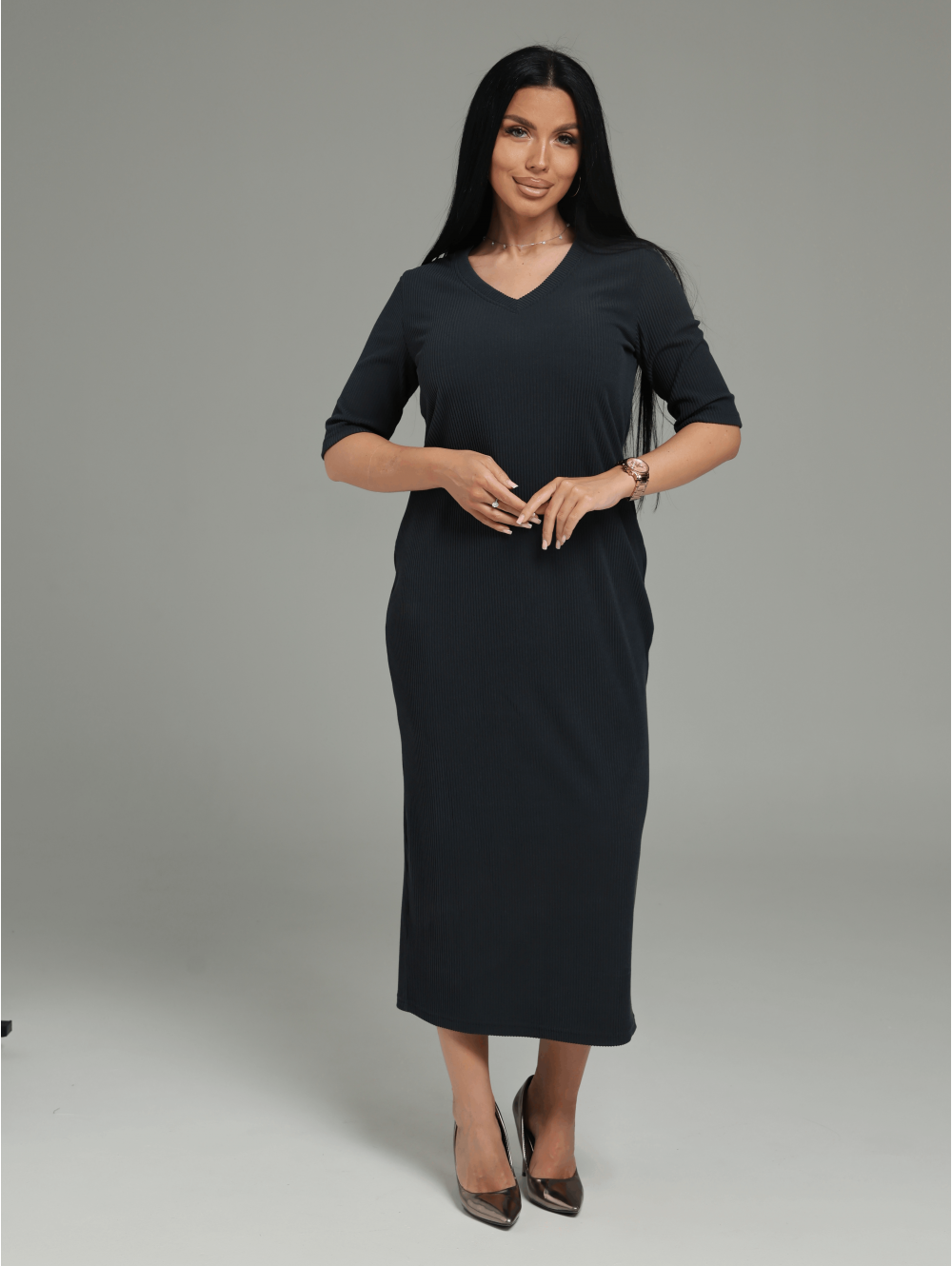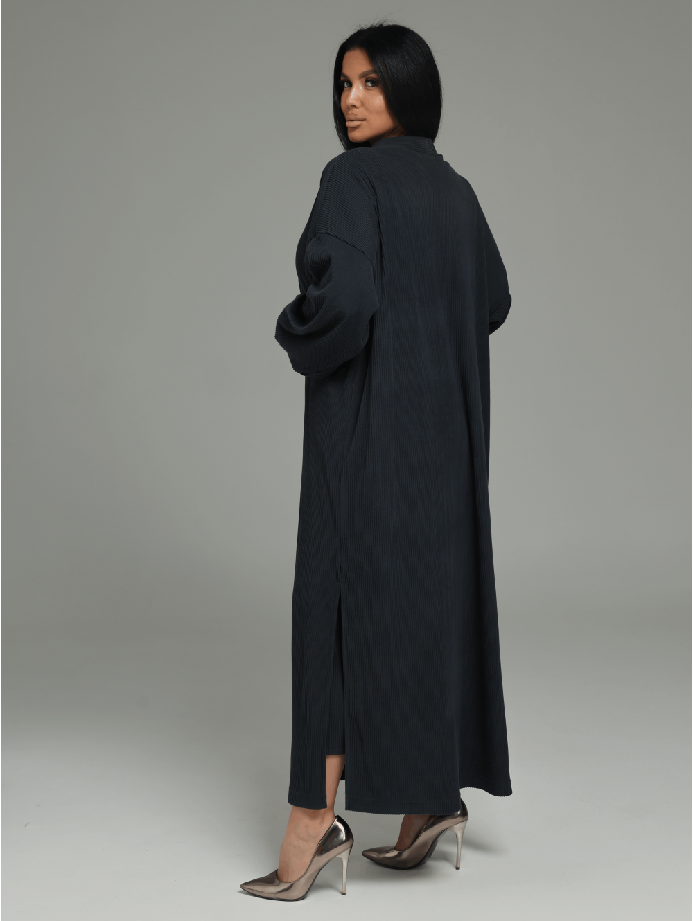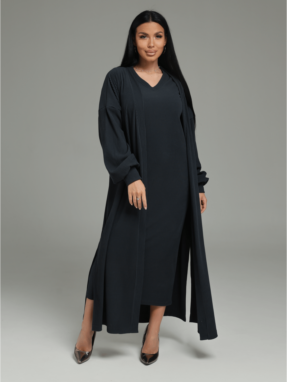 Безупречная посадка: Платье прилегающего кроя повторяет изгибы тела, а свободный кардиган с боковыми разрезами позволяет легко двигаться и создает летящий силуэт.