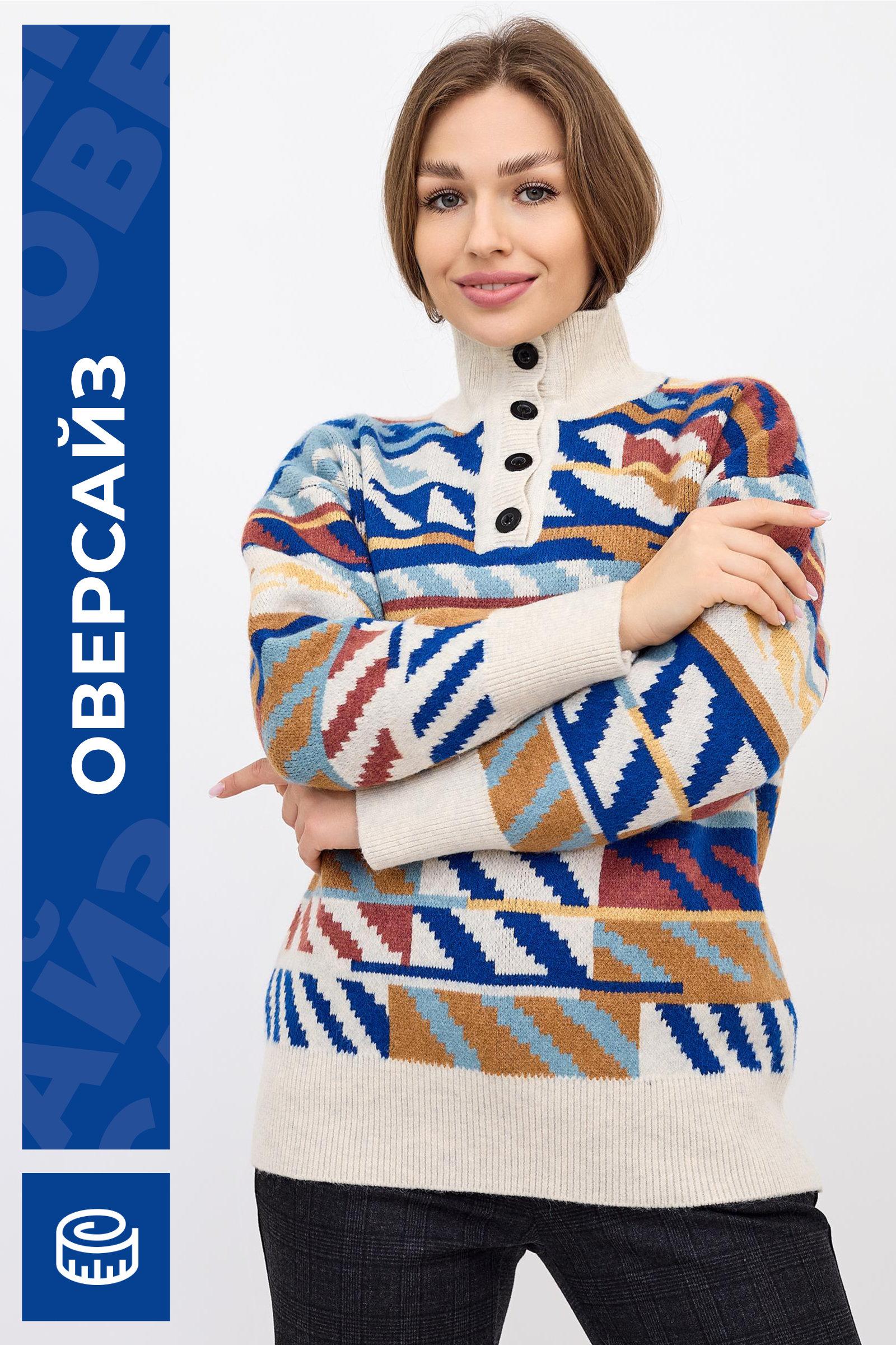 Привлекательный, яркий и очень теплый джемпер Камилла согреет в холодную погоду. Главное украшение джемпера - колоритный орнамент сочетает сразу несколько цветовых гамм. Воротник стоечка застегивается на пуговицы и тем самым делает модель еще более уютной и теплой. Широкие манжеты, воротник стойка и окантовка по низу модели джемпера выполнена плотной вязкой для сохранения тепла и удобства в ежедневной носке. Джемпер прост в уходе, допускается деликатная стирка и глажка. Хорошо сочетается с любыми вещами базового гардероба.