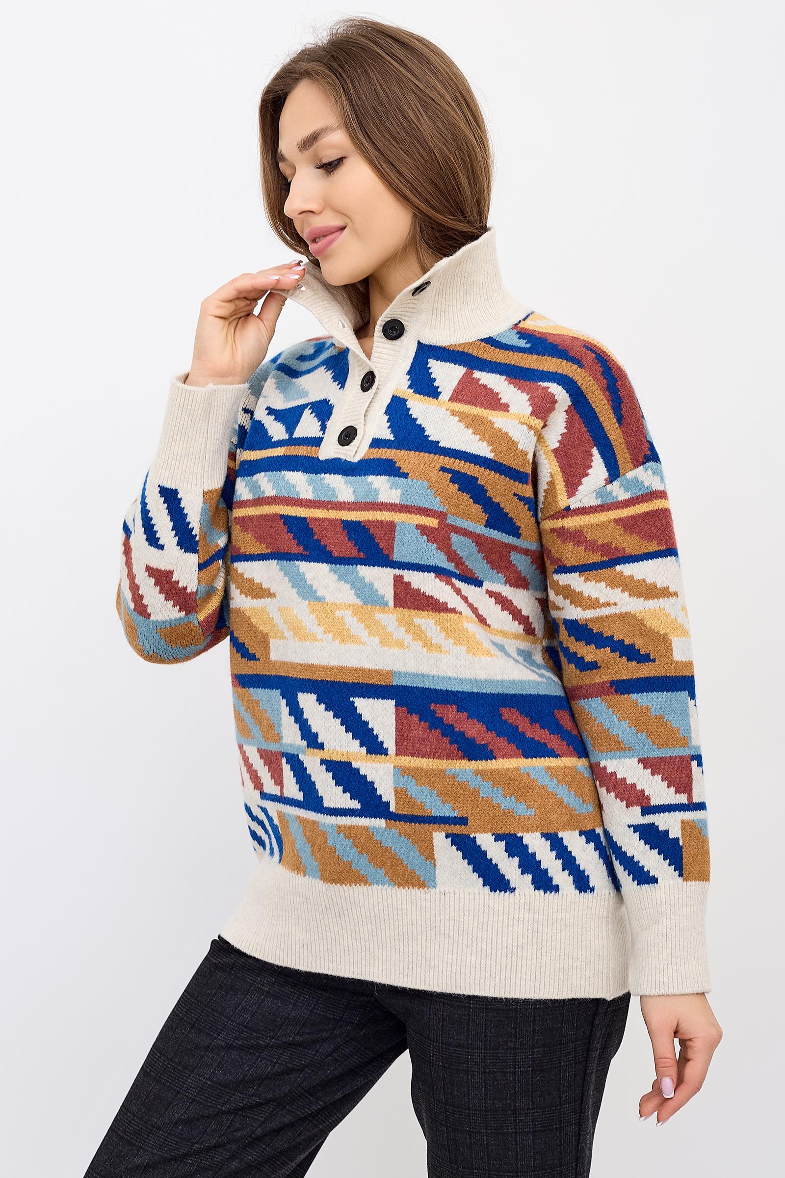 Привлекательный, яркий и очень теплый джемпер Камилла согреет в холодную погоду. Главное украшение джемпера - колоритный орнамент сочетает сразу несколько цветовых гамм. Воротник стоечка застегивается на пуговицы и тем самым делает модель еще более уютной и теплой. Широкие манжеты, воротник стойка и окантовка по низу модели джемпера выполнена плотной вязкой для сохранения тепла и удобства в ежедневной носке. Джемпер прост в уходе, допускается деликатная стирка и глажка. Хорошо сочетается с любыми вещами базового гардероба.