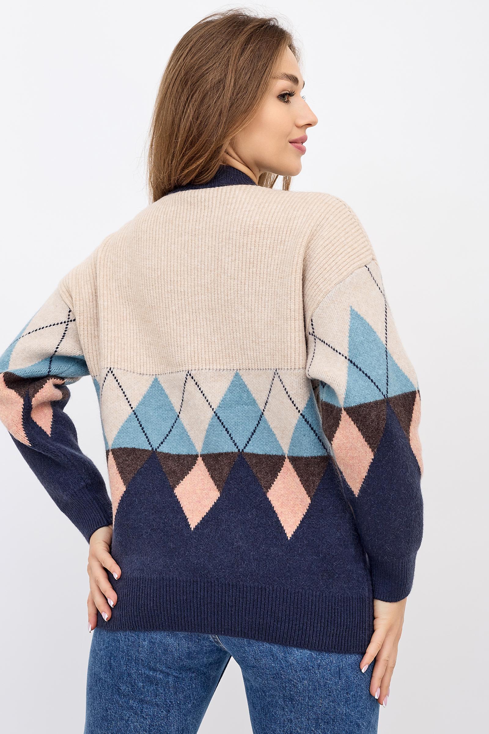 Классический зимний женский джемпер в стильном исполнении в виде ромбов. Красивый и чувственный джемпер подчеркнет женственность и нежность своей обладательницы. Теплый, универсальный свитер подойдет для любой фигуры. В нем все отлично сочетается – свободная посадка, длинные рукава и яркий рисунок.
