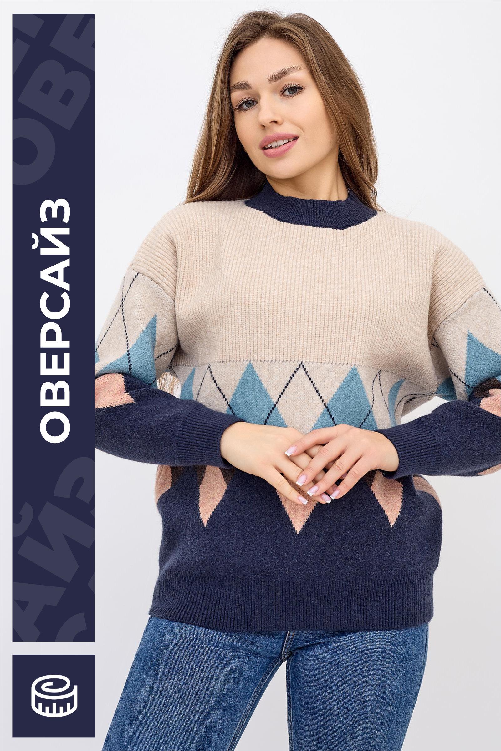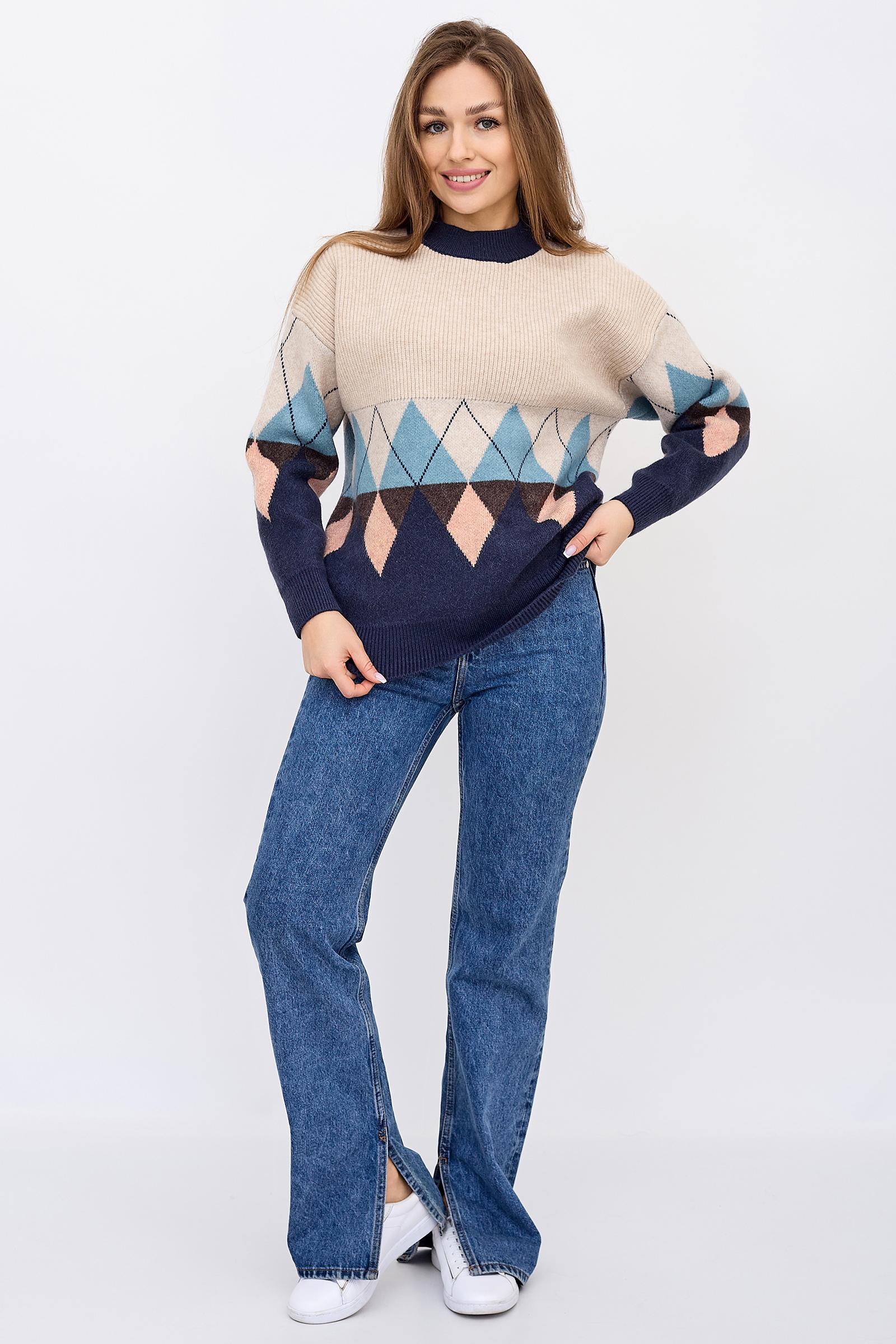 Классический зимний женский джемпер в стильном исполнении в виде ромбов. Красивый и чувственный джемпер подчеркнет женственность и нежность своей обладательницы. Теплый, универсальный свитер подойдет для любой фигуры. В нем все отлично сочетается – свободная посадка, длинные рукава и яркий рисунок.