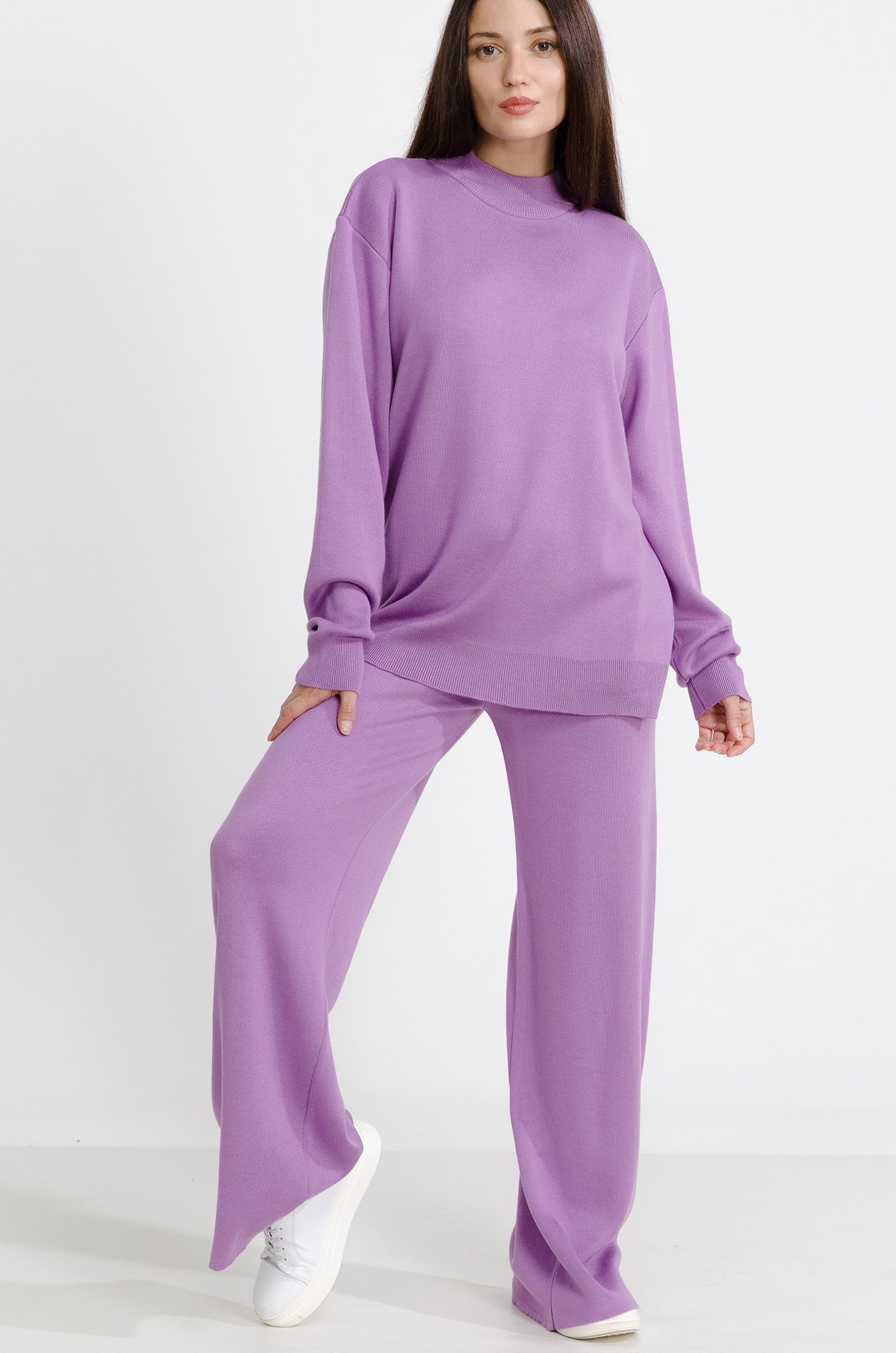 Вязаный женский костюм оверсайз с брюками позволит выглядеть женственно даже в холода. Теплый костюм выполнен из нежного вязаного трикотажа с добавлением вискозы, он прекрасно сохраняет тепло – идеальная база для прохладной осени и весны. В комплекте джемпер и прямые свободные брюки. Однотонный костюм лилового цвета – сочетание элегантности и невероятного уюта.