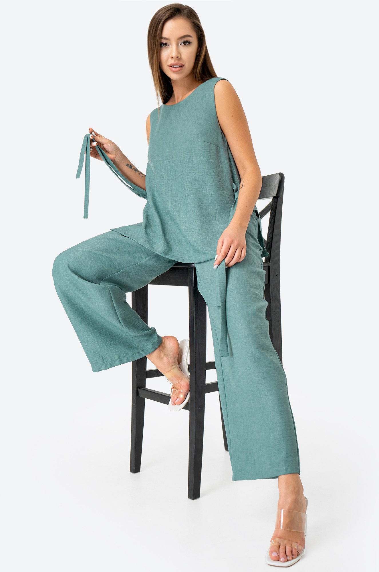Брюки прямого кроя с боковыми карманами не стесняют движений, очень удобны и дарят ощущение лёгкости в жаркую погоду. Элементы мятного костюма можно надевать как вместе, так и отдельно.