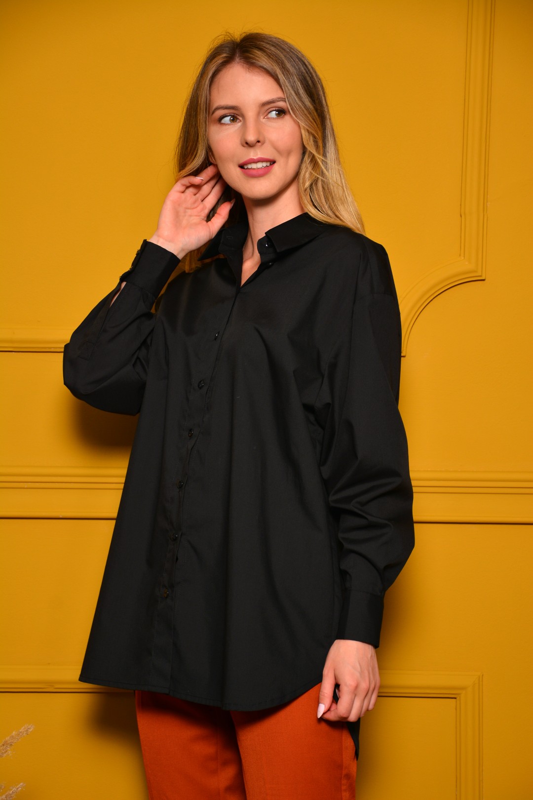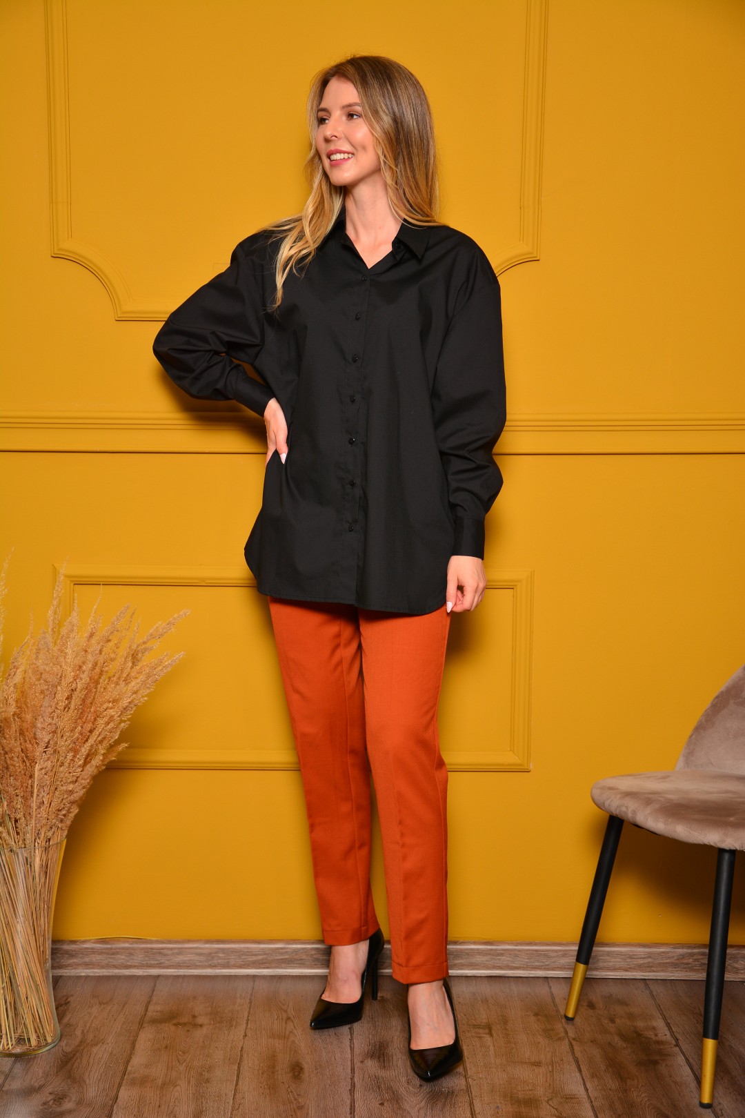 Объёмная рубашка «мужского» кроя без вытачек. Рукава длиной 75 см втачные с манжетой на 2 петли и пуговицы. Воротник отложной со стойкой. Кокетка на спинке, спинка со складкой. Низ фигурный. Спинка длиннее переда, длина блузы по спинке 79 см.