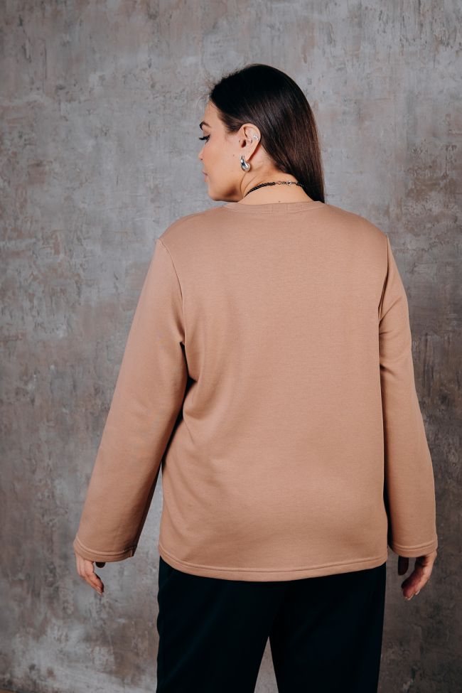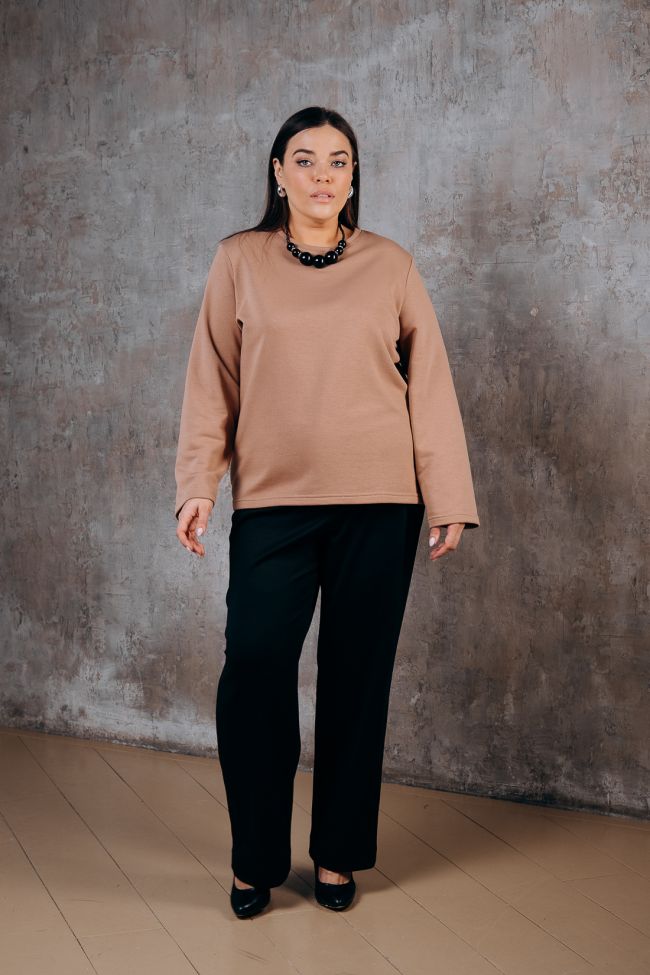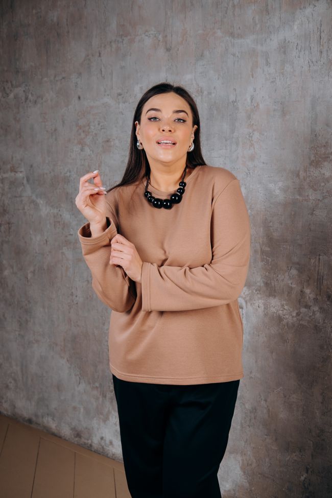 светло-коричневый Классический лонгслив прямого силуэта из плотного трикотажа "футер". Вырез горловины круглый оформлен бейкой. Рукава втачные, прямые,  длиные со спущенной линией плеча.  Низ ровный. Лонгслив прекрасно дополнит повседневный гардероб в прохладное время года.