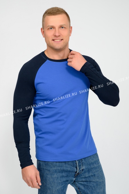 Лонгслив выполнен из качественного эластичного трикотажного полотна и скомбинирован из двух цветов, темного синего и василькового оттенка. Модель с прилегающей посадкой по фигуре оптимальной длины, имеет рукав реглан и округлую горловину.