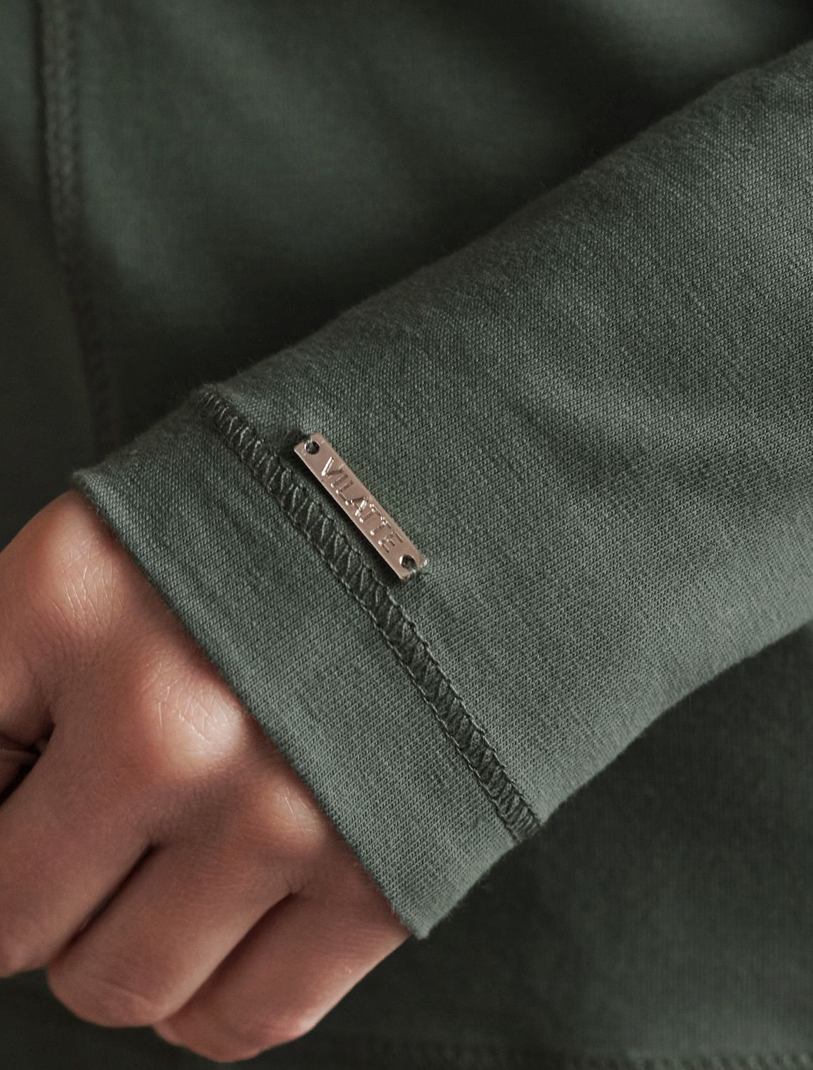 Лонгслив выполнен из премиального хлопка с эластаном. Модель прилегающего силуэта идеально сидит по фигуре. Хорошо подойдет первым слоем в многослойные образы. Фишкой изделия служат декоративные швы и фирменный металлический логотип бренда на рукаве. оливковый