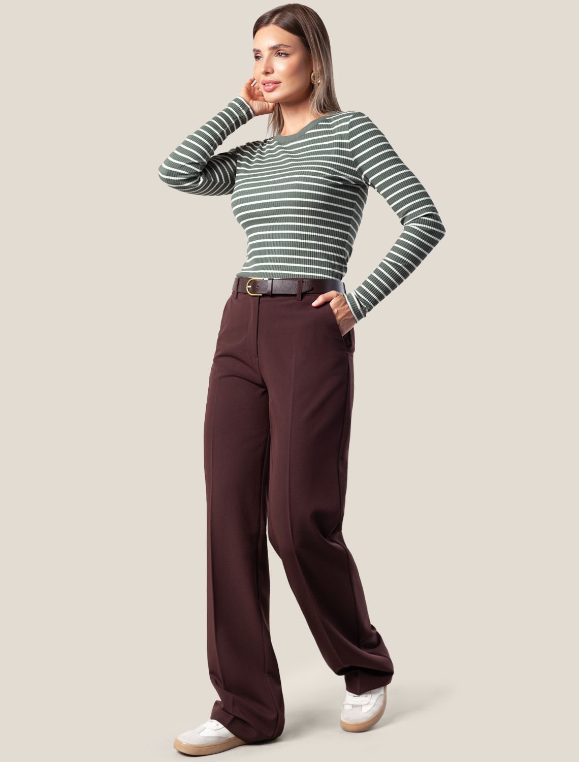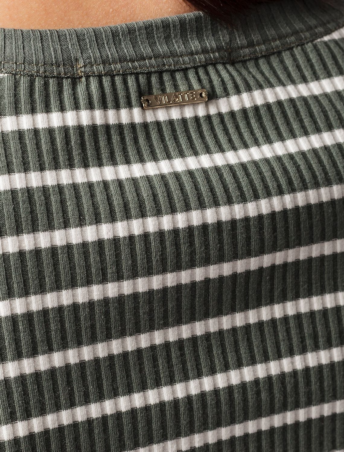 Лонгслив с узким рукавом выполнен из трикотажа в широкий рубчик. Мягкий и эластичный трикотаж безупречно держит форму и комфортно сидит по фигуре, не сковывая движения. Модель дополнена металлическим логотипом бренда. оливковый-белый