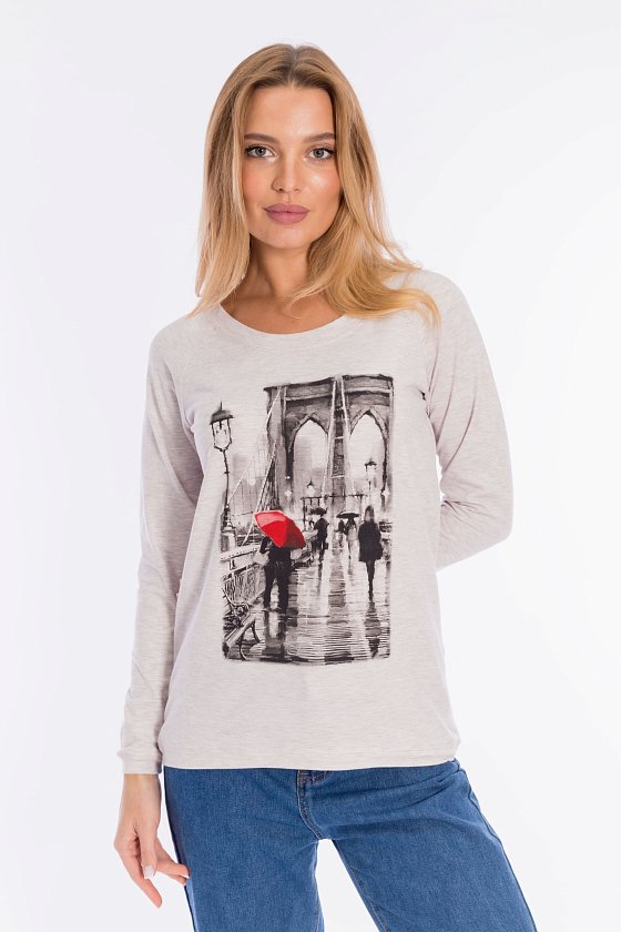 Толстовка выполнена из кулирки с лайкрой. Вырез горловины круглый, длинные рукава покроя реглан, спереди нанесён принт. Низ изделия разноуровневый, сзади длиннее, чем спереди. Горловина, низ рукавов и изделия отделаны эластичной тканью в цвет основного полотна.