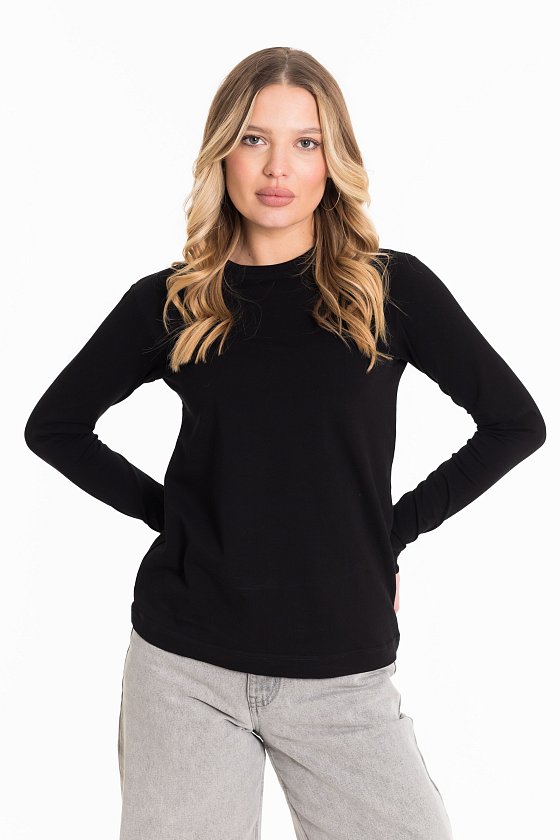 Лонгслив женский выполнен из однотонной кулирки с лайкрой. Модель с длинными рукавами и круглым вырезом горловины, оформленным планкой. Лонгслив-идеальная основа для любого образа, отлично сочетается с джинсами, брюками, кардиганами  и другими предметами гардероба.