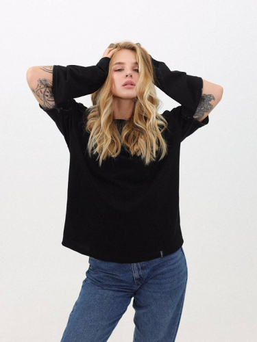 Женский лонгслив из футера двухнитки в чёрном цвете — универсальная и стильная основа для повседневного гардероба. Модель со спущенной линией плеча и свободным силуэтом обеспечивает комфорт и лёгкость в движении. Горловина оформлена притачной планкой, низ изделия дополнен аккуратной нашивкой-флажком, придающей современный акцент. Рукава можно трансформировать: при желании отстегнуть молнию и превратить лонгслив в футболку. Один предмет — два варианта образа, подходящих для любого сезона.