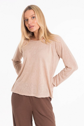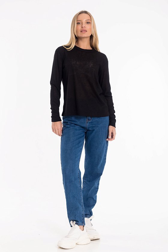 Женский лонгслив из полотна "поливискон". Модель свободного силуэта со спущенной линией плеча и круглой горловиной, оформленной широкой бейкой. Универсальный вариант для комфортных повседневных образов.